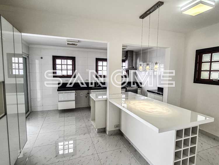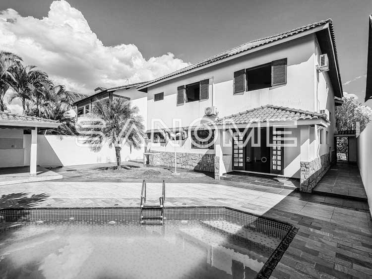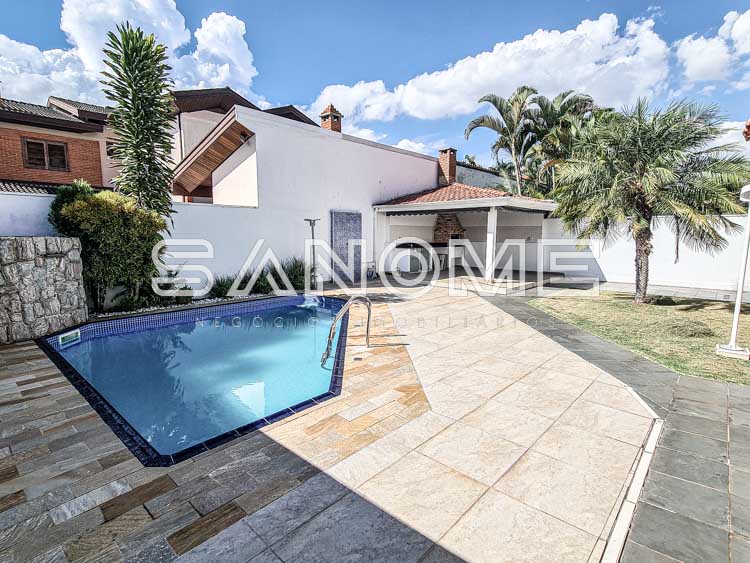 Piso térreo: Hall de entrada com lavabo, Escritório/Sala de TV, Sala 2 ambientes, Cozinha planejada com copa, Despensa, Área de serviço, Quarto e banheiro de empregados, Amplo quintal gramado com paisagismo, Área de churrasqueira e Piscina com cascata.
