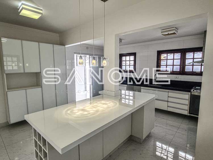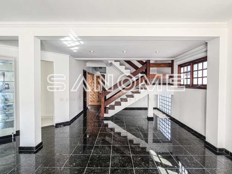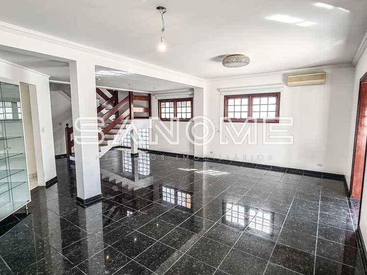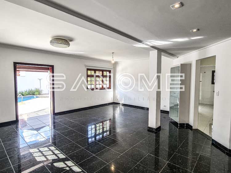 Piso térreo: Hall de entrada com lavabo, Escritório/Sala de TV, Sala 2 ambientes, Cozinha planejada com copa, Despensa, Área de serviço, Quarto e banheiro de empregados, Amplo quintal gramado com paisagismo, Área de churrasqueira e Piscina com cascata.