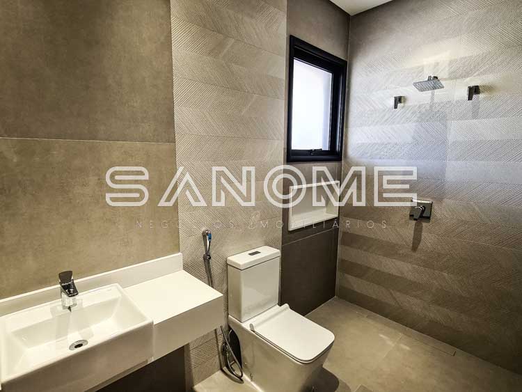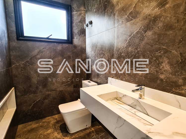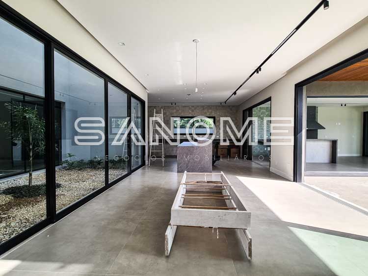 Piso térreo: Hobby box, Hall de entrada, Escritório, Depósito de jardinagem, Elevador, Sala de estar e sala de jantar, Área gourmet, Saleta com banheiro, Lavabo, Cozinha com despensa, Adega, Área de serviço, Banheiro de serviço, Lavabo, Piscina (com raia, prainha e deck), Sauna, Depósito da piscina.