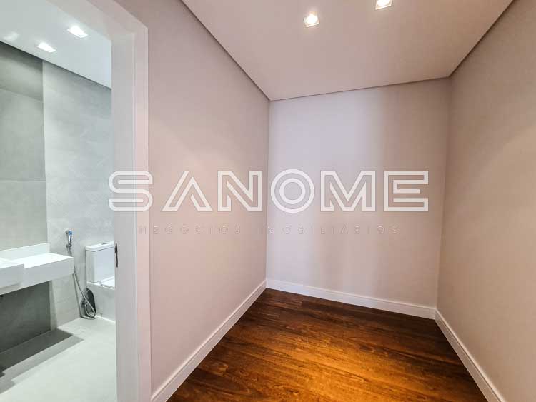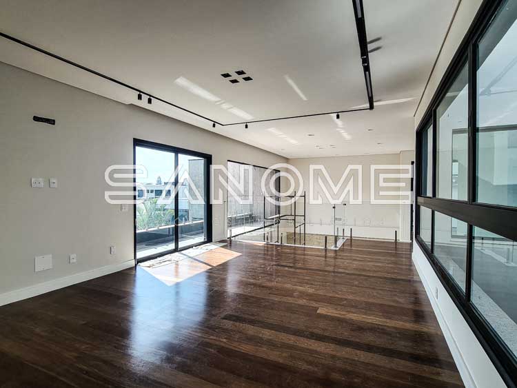 Piso superior: Ampla sala íntima com varanda, Suíte master com sala de banho, closet, varanda e hidromassagem, 2 suítes com varanda e closet, e 1 suíte com closet.
