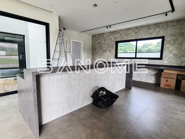 Piso térreo: Hobby box, Hall de entrada, Escritório, Depósito de jardinagem, Elevador, Sala de estar e sala de jantar, Área gourmet, Saleta com banheiro, Lavabo, Cozinha com despensa, Adega, Área de serviço, Banheiro de serviço, Lavabo, Piscina (com raia, prainha e deck), Sauna, Depósito da piscina.
