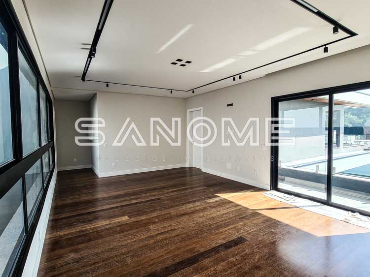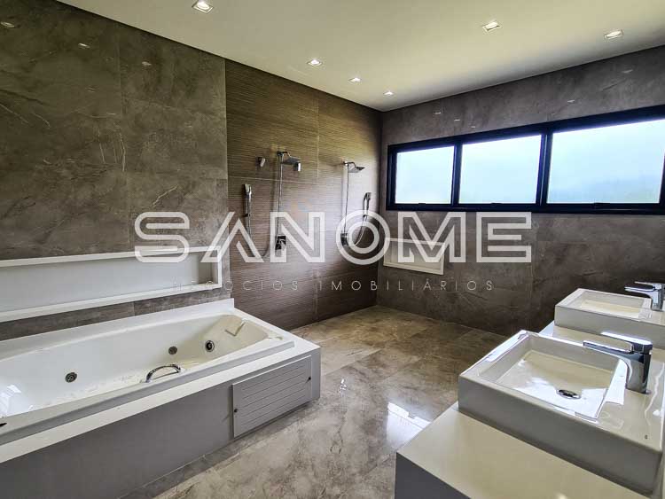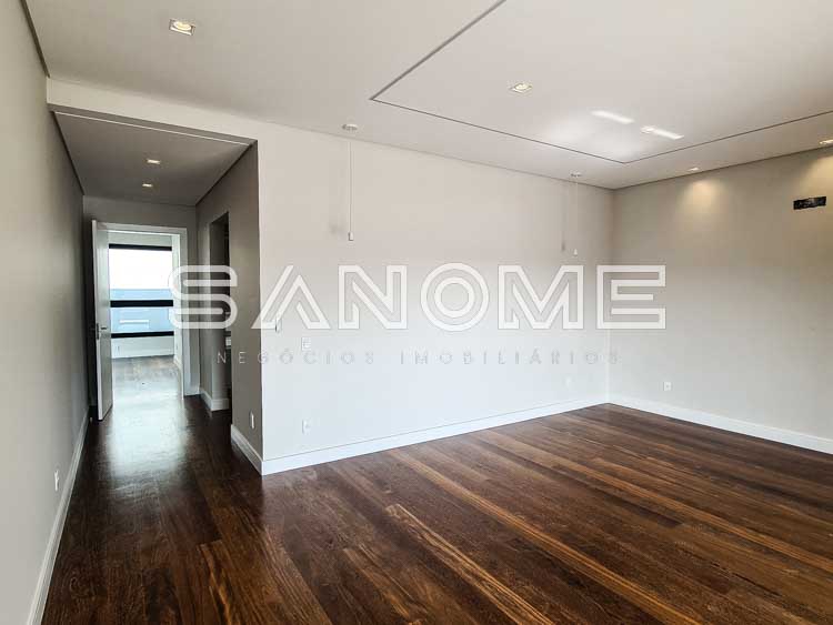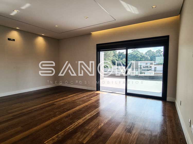 Piso superior: Ampla sala íntima com varanda, Suíte master com sala de banho, closet, varanda e hidromassagem, 2 suítes com varanda e closet, e 1 suíte com closet.