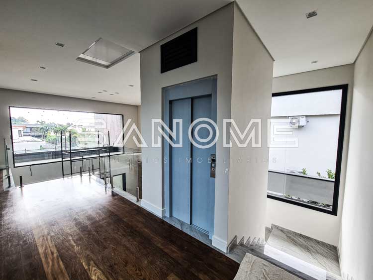 Piso térreo: Hobby box, Hall de entrada, Escritório, Depósito de jardinagem, Elevador, Sala de estar e sala de jantar, Área gourmet, Saleta com banheiro, Lavabo, Cozinha com despensa, Adega, Área de serviço, Banheiro de serviço, Lavabo, Piscina (com raia, prainha e deck), Sauna, Depósito da piscina.