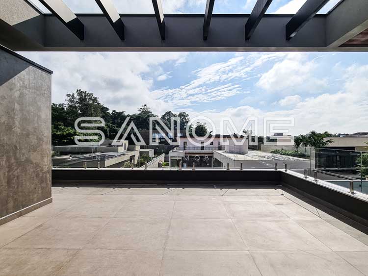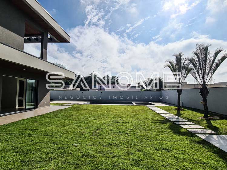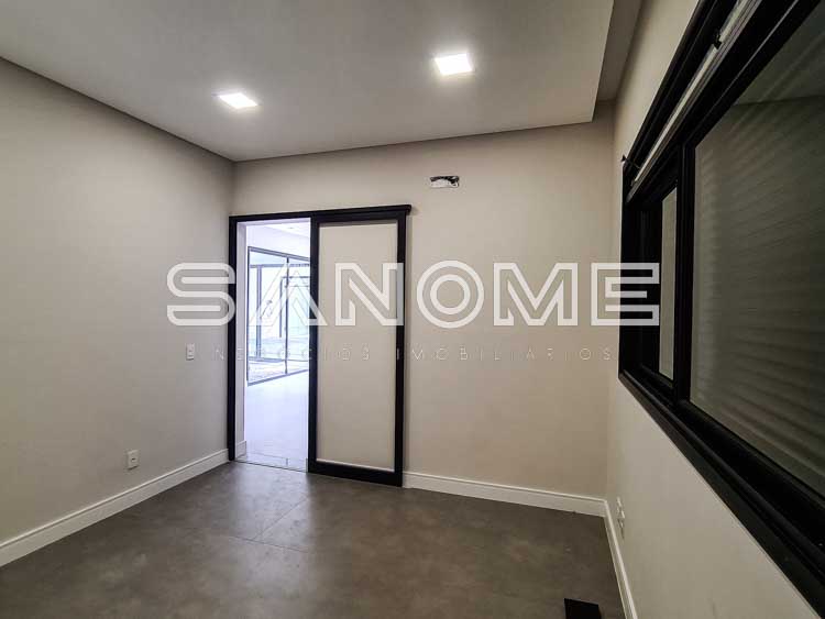 Piso térreo: Hobby box, Hall de entrada, Escritório, Depósito de jardinagem, Elevador, Sala de estar e sala de jantar, Área gourmet, Saleta com banheiro, Lavabo, Cozinha com despensa, Adega, Área de serviço, Banheiro de serviço, Lavabo, Piscina (com raia, prainha e deck), Sauna, Depósito da piscina.