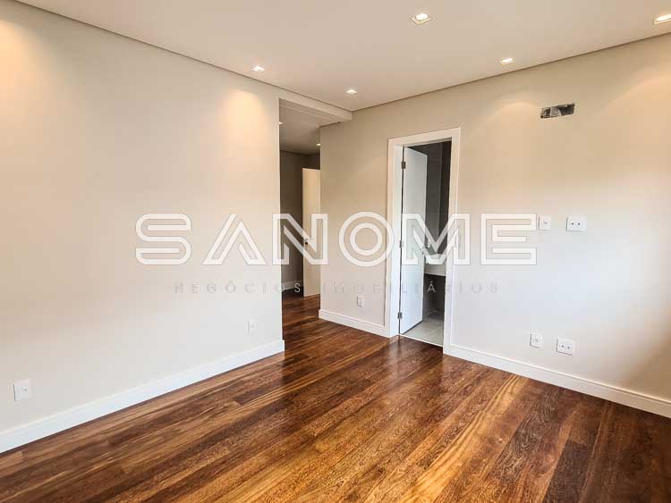 Piso superior: Ampla sala íntima com varanda, Suíte master com sala de banho, closet, varanda e hidromassagem, 2 suítes com varanda e closet, e 1 suíte com closet.