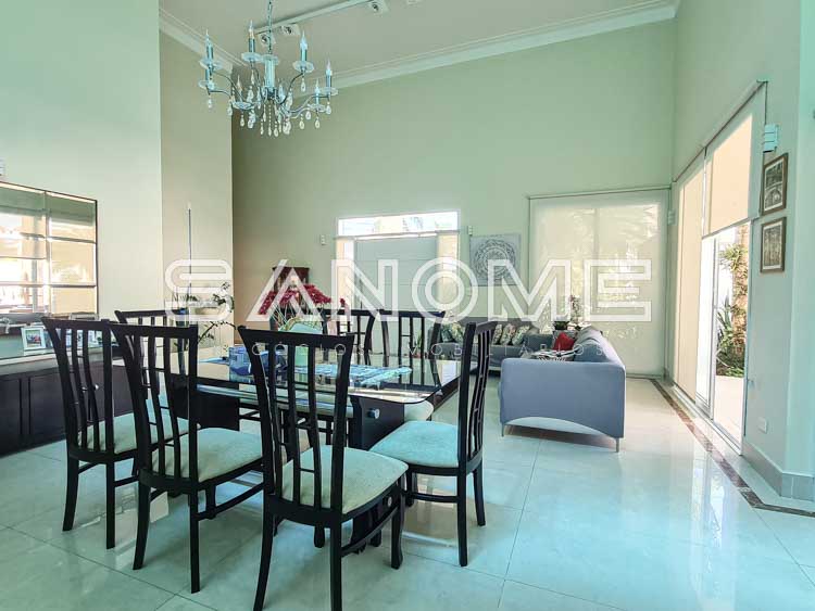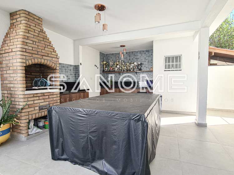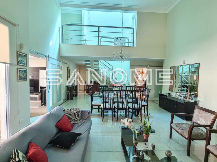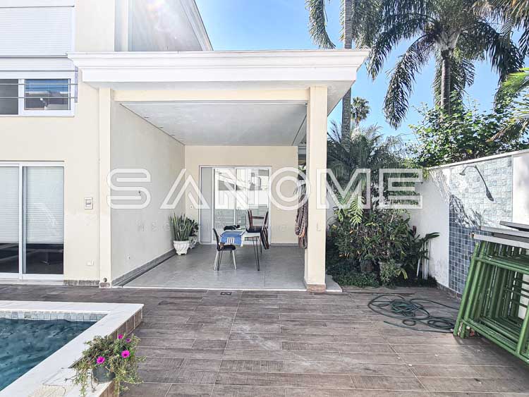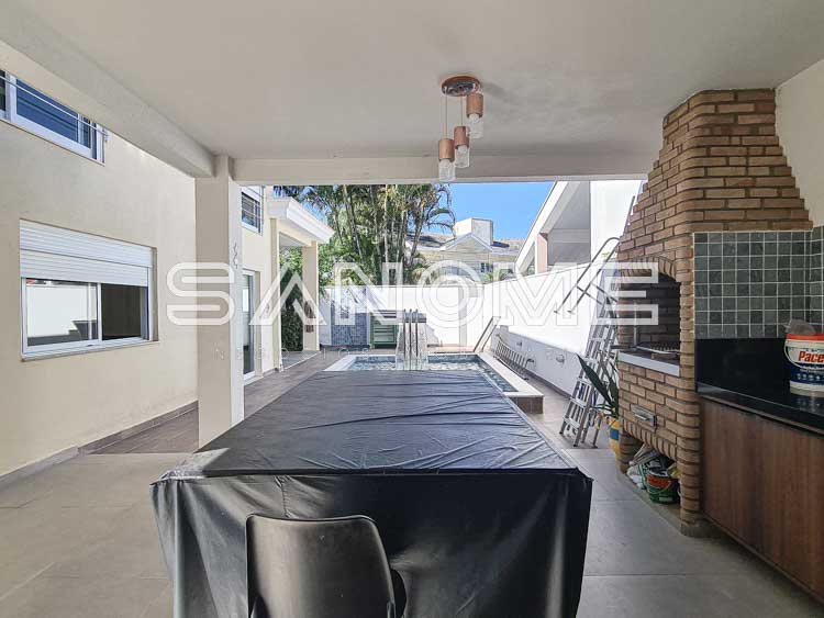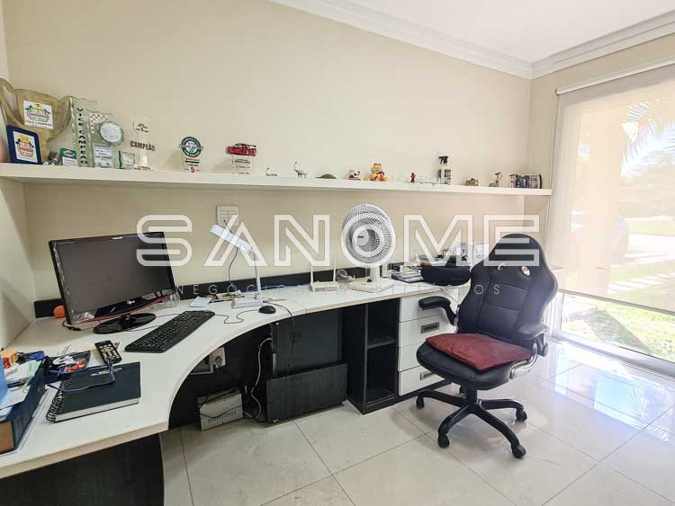 Piso térreo: 2 dormitórios, Banheiro social, Sala de estar e sala de jantar com pé direito duplo, Escritório, Lavabo, Sala de TV, Cozinha planejada, Área de serviço, Quintal com piscina e Área de churrasqueira com banheiro de lazer externo.