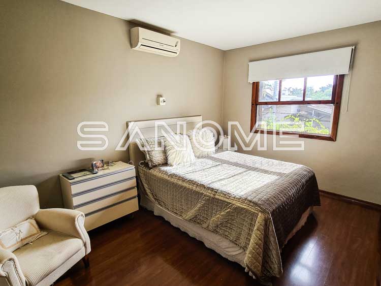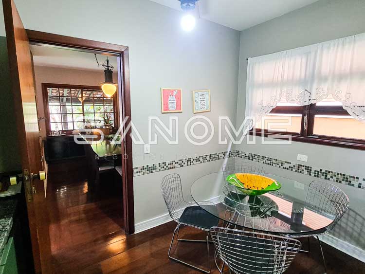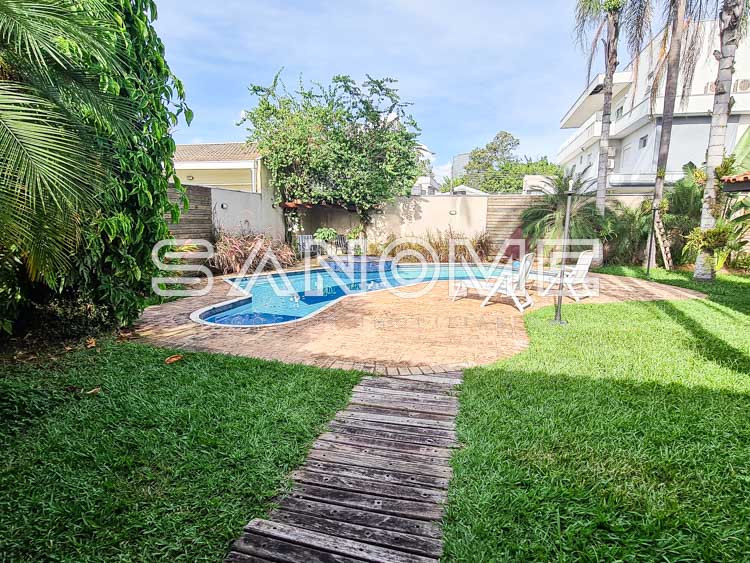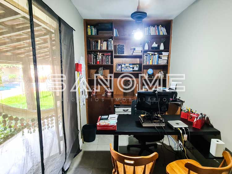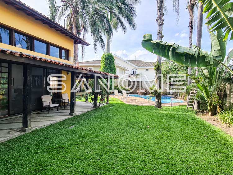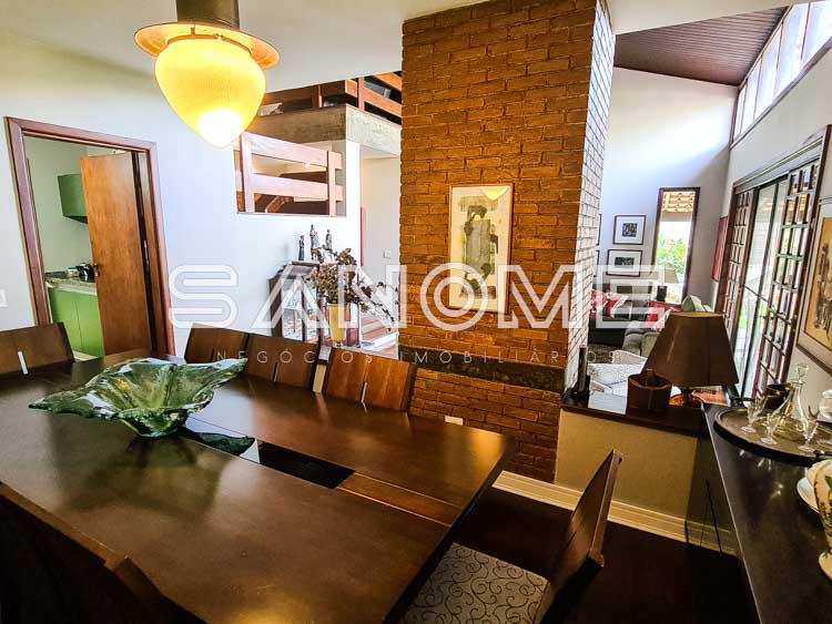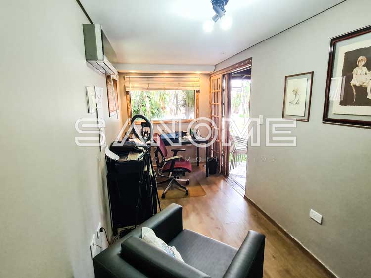 Piso térreo: Hall de entrada com lavabo, Sala de estar com lareira e integrada a área externa, Sala de jantar, Cozinha planejada com copa, Despensa, Área de serviço, Quarto e banheiro de empregados, Depósito, Escritórios (1 interno e 1 externo com banheiro), Amplo quintal gramado, Área de churrasqueira coberta e Piscina com spa.