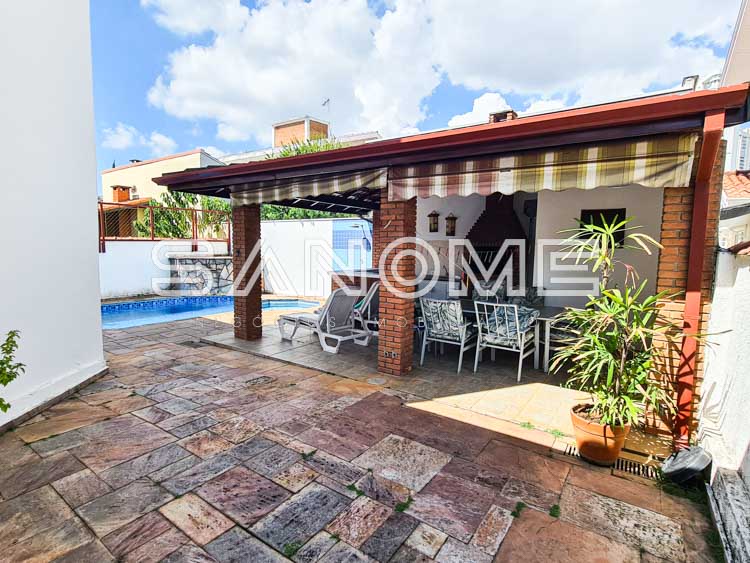 Piso principal: 3 suítes (1 master com closet, banheira e acesso para área de lazer), Salas de estar e de jantar, Barzinho, Cozinha planejada com copa, Área de churrasqueira, Banheiro de lazer externo e Piscina com spa.