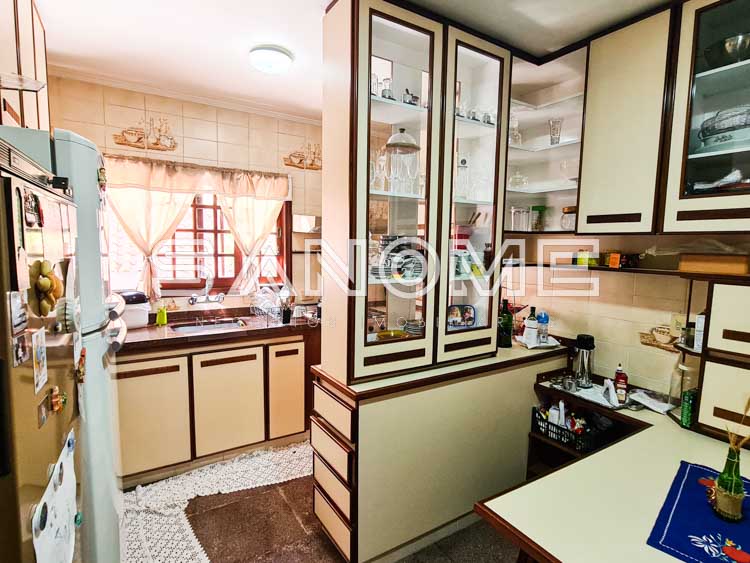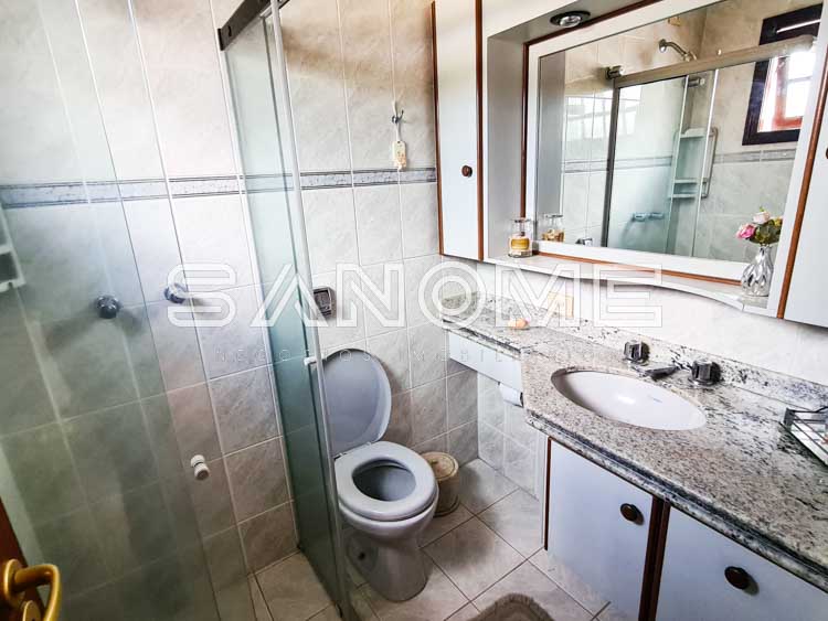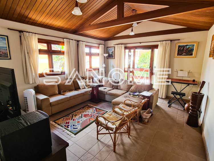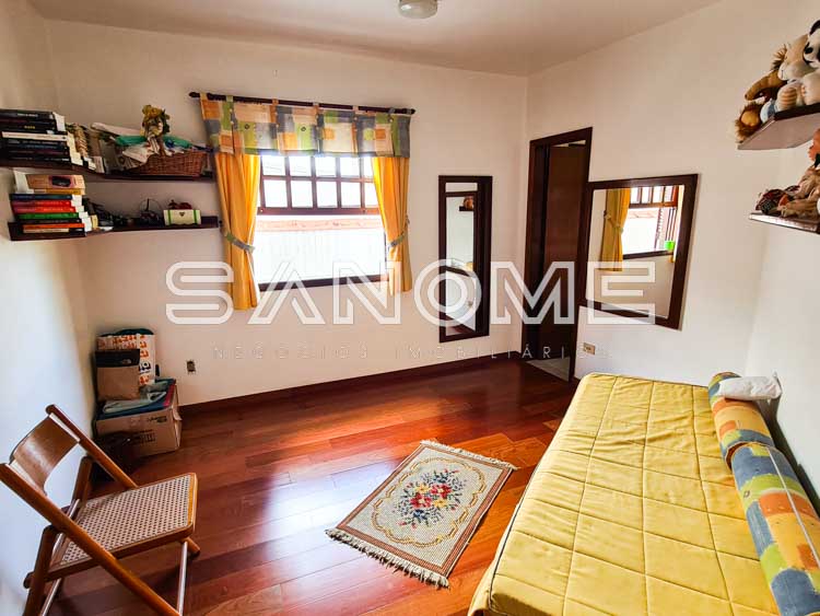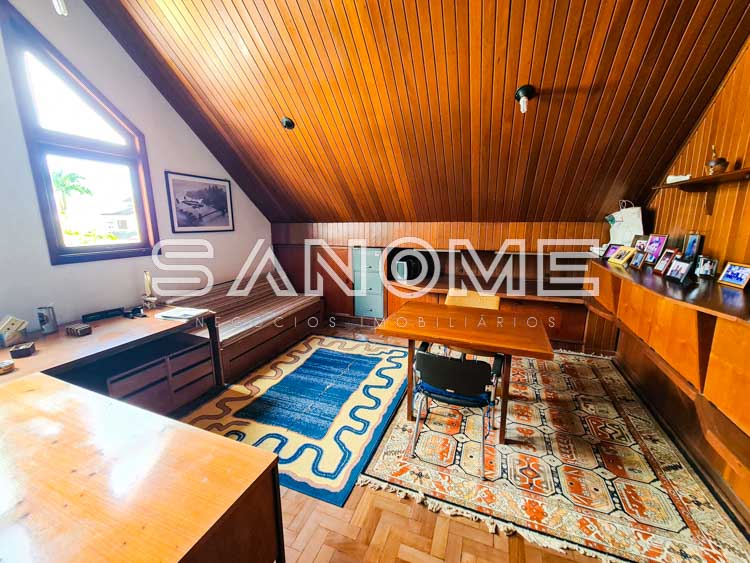 Piso superior (sótão): Sala íntima, Banheiro social, Amplo dormitório com armários, Escritório e Ampla sala de TV com sacada.