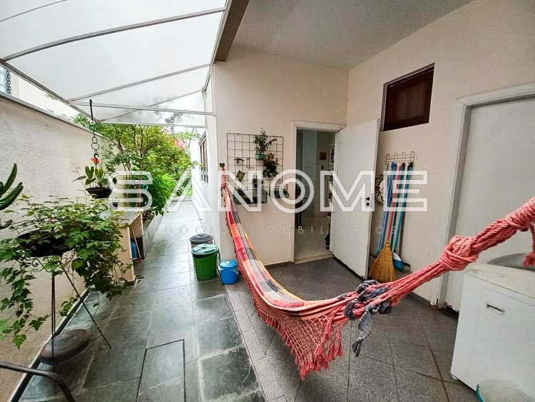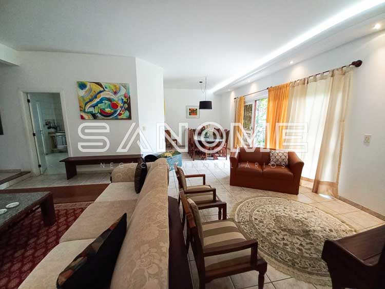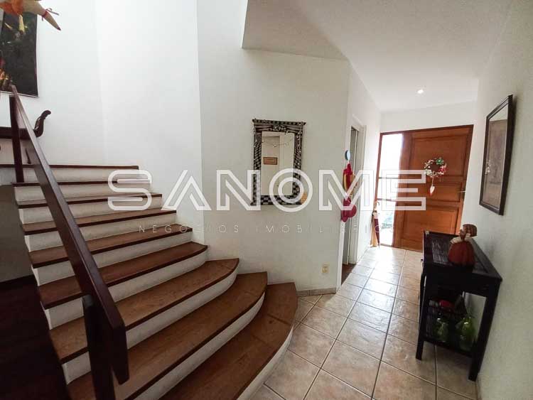 Piso térreo: Sala de estar, Sala de jantar integrada a área externa, Escritório/Sala de TV, Lavabo, Cozinha planejada, Área de serviço, Quartinho multiuso, Banheiro de empregados e Amplo quintal gramado.