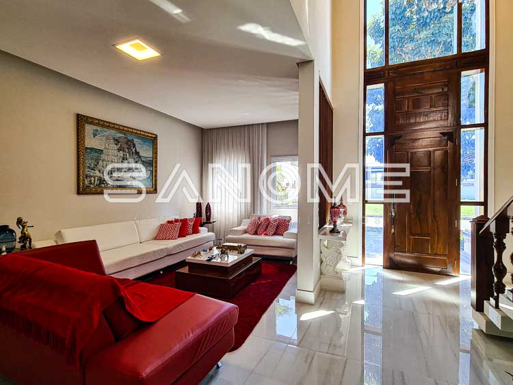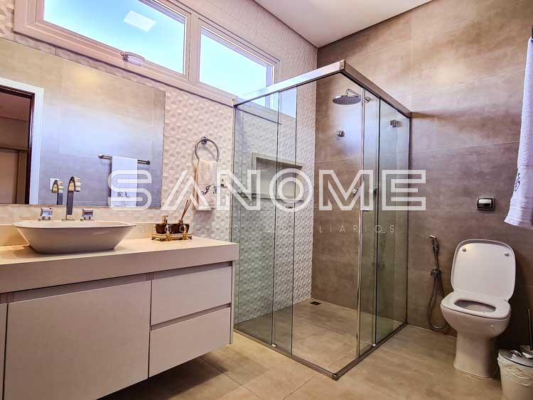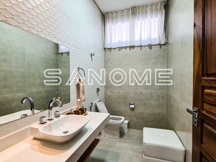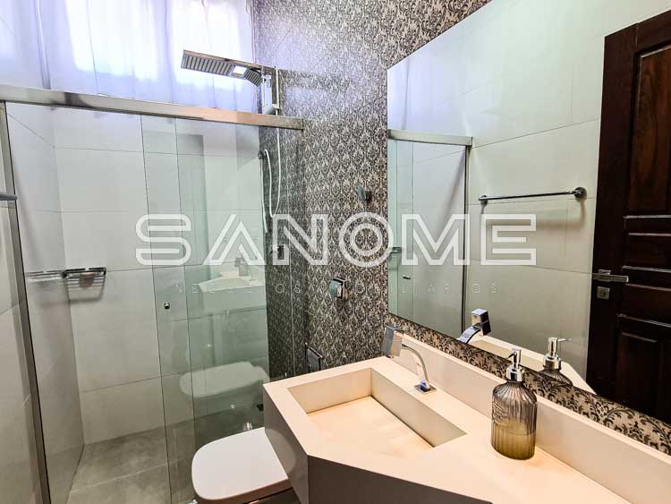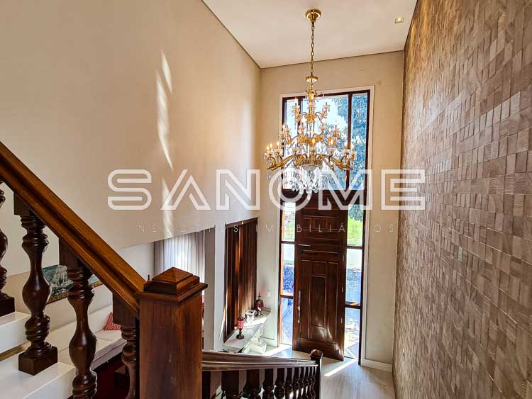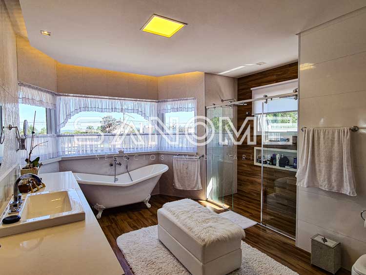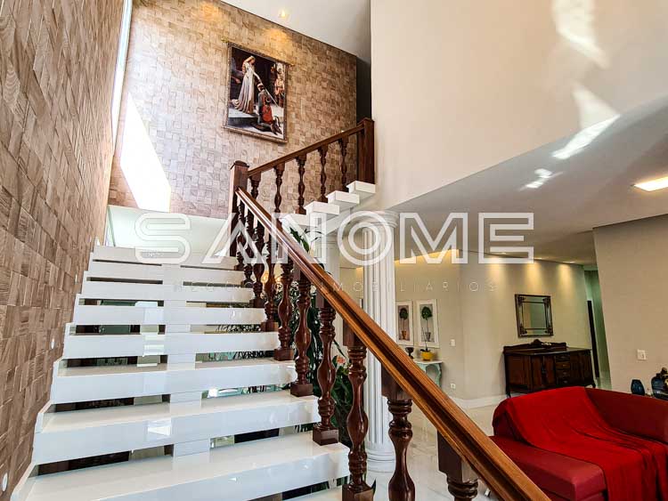 Piso superior: 4 suítes completas (master com 2 closets, ampla varanda externa e sala de banho).