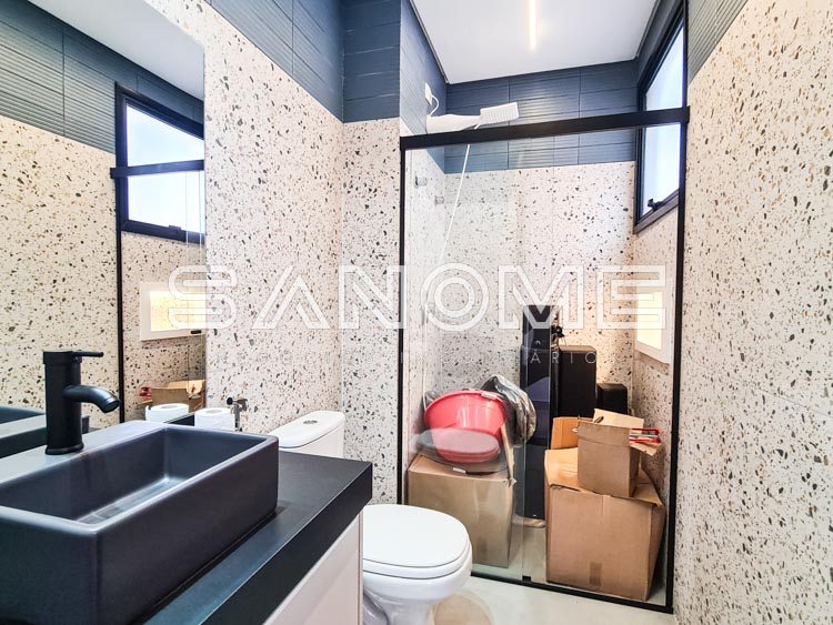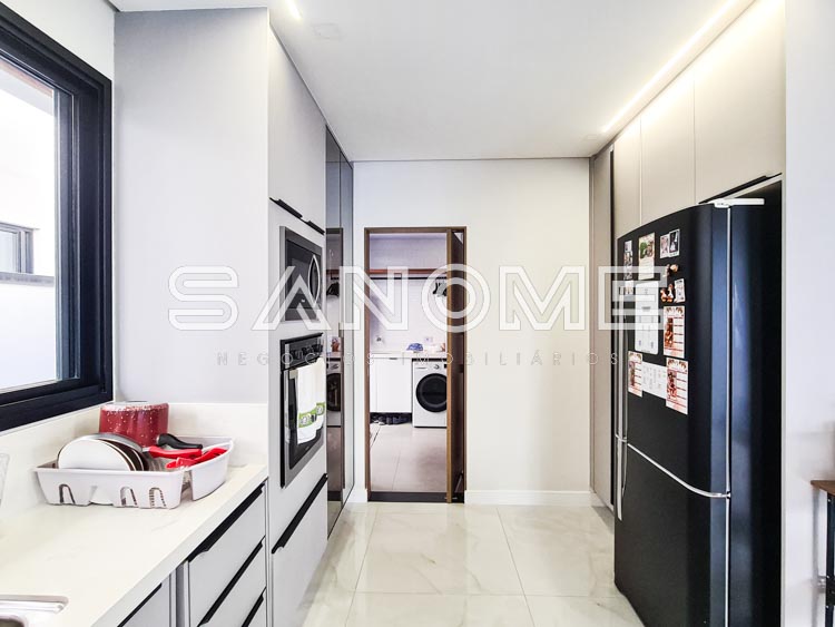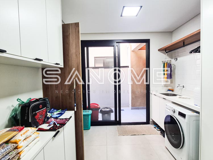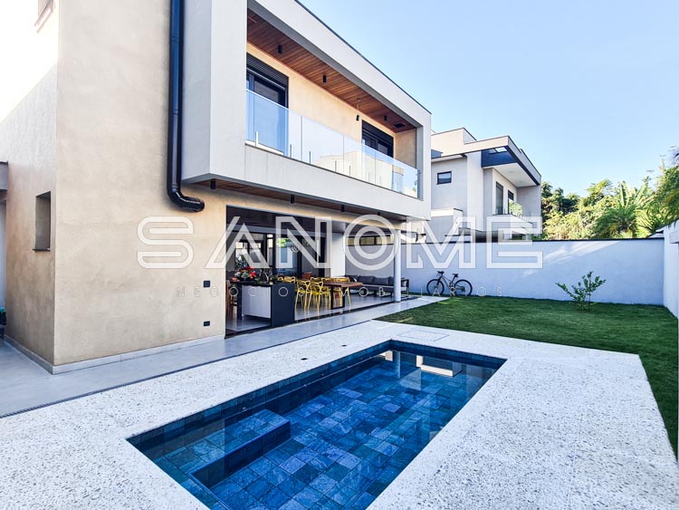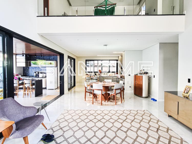 Piso térreo: Hall de entrada, Lavabo, Escritório (reversível +1 suíte), Elevador instalado, Adega, Sala de jantar, Sala de estar com pé direito duplo, Cozinha integrada à área gourmet, Área de serviço com despensa, Espaço para horta, Banheiro de empregados, Área gourmet com banheiro de lazer e Piscina.