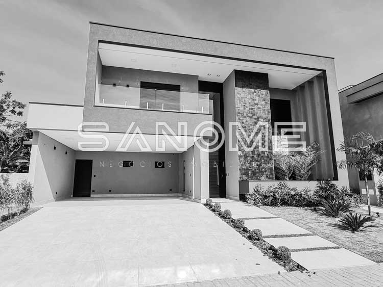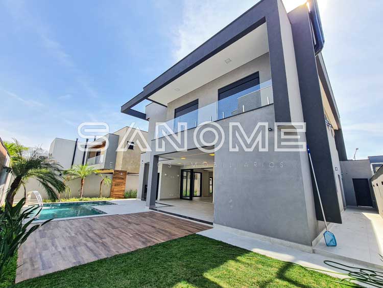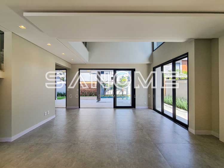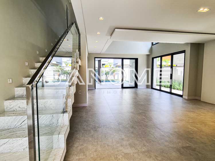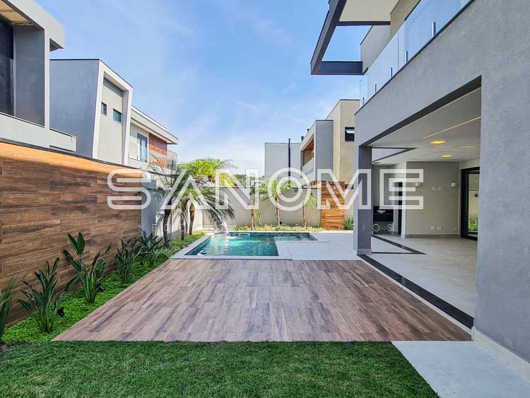 Piso térreo: Salas integradas, Escritório, Lavabo, Quarto multiuso, Cozinha integrada, Despensa, Área de serviço, Área gourmet completa, Banheiro de lazer externo, Quintal gramado e Piscina aquecida com cascata.