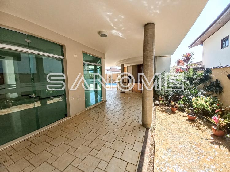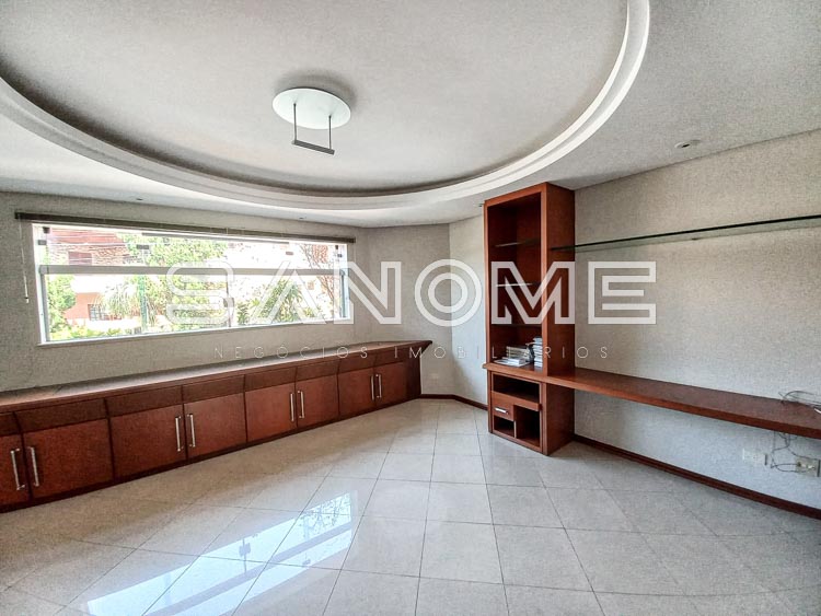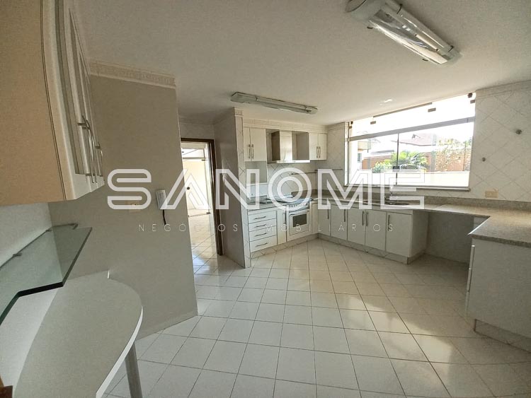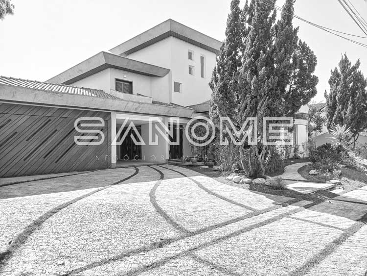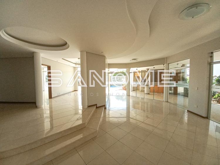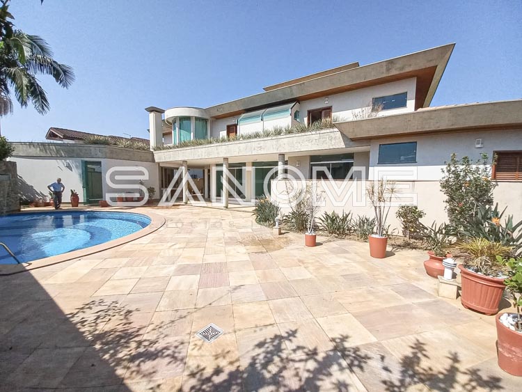 Piso térreo: 4 vagas de garagem cobertas (portão automático de mogno), Hall de entrada, Acesso para adega subterrânea, Lavabo, Sala de estar, Sala de jantar, Sala de almoço, Escritório com armários, Sala de TV, Cozinha com despensa, Área de serviço com quarto e banheiro de empregados, Varanda externa, Área de churrasqueira, Sauna, Piscina com cascata e aquecida (aquecedor solar), Edícula com cozinha e banheiro, Canil, Depósito e horta.