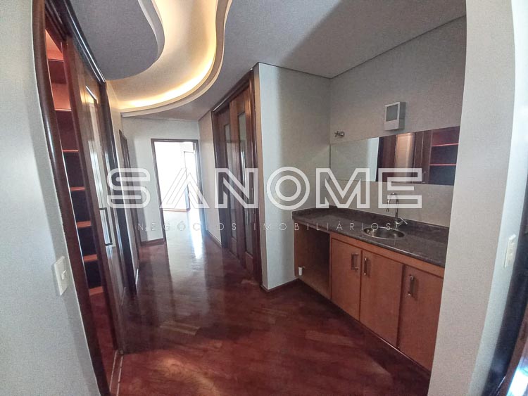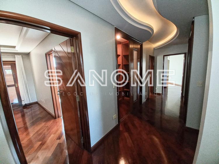 Piso superior: Suíte de hóspedes com armários e varanda, Corredor íntimo com roupeiros e copinha, Suíte master com closet, saleta, varanda e hidromassagem e 2 suítes com armários e varanda.