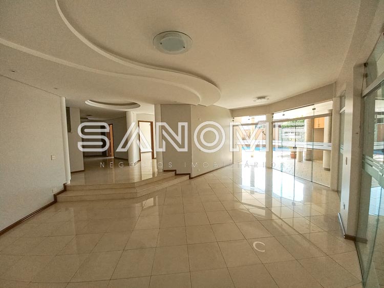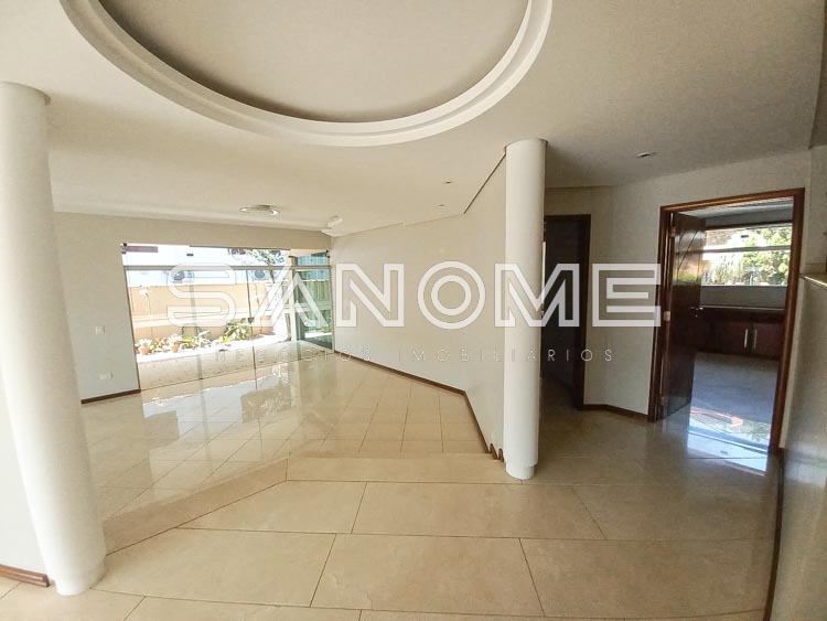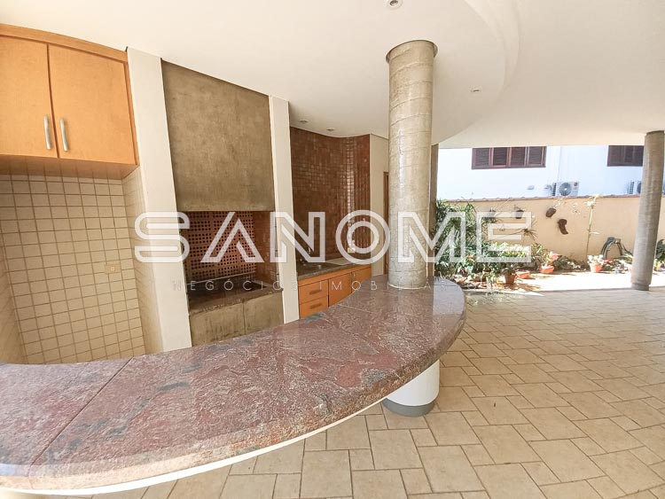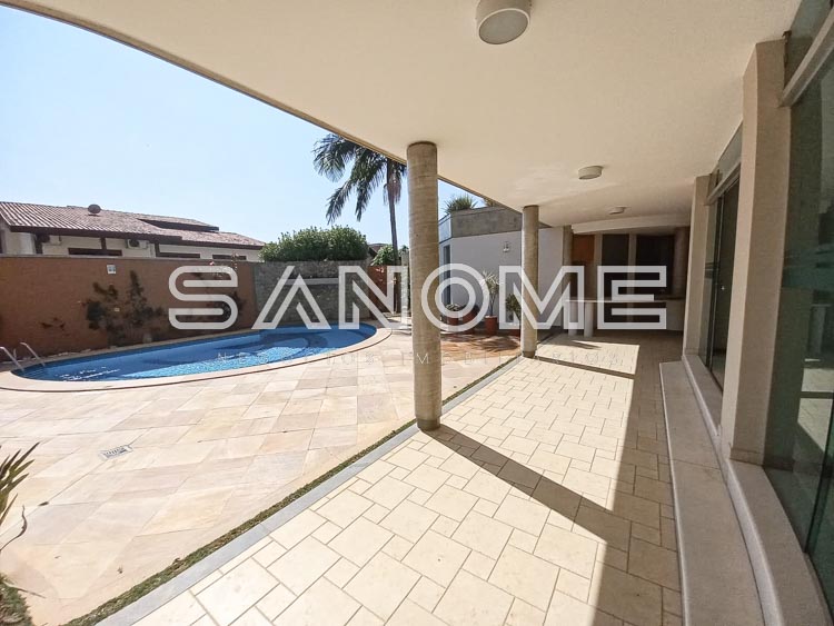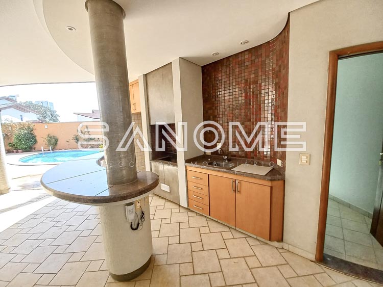 Piso térreo: 4 vagas de garagem cobertas (portão automático de mogno), Hall de entrada, Acesso para adega subterrânea, Lavabo, Sala de estar, Sala de jantar, Sala de almoço, Escritório com armários, Sala de TV, Cozinha com despensa, Área de serviço com quarto e banheiro de empregados, Varanda externa, Área de churrasqueira, Sauna, Piscina com cascata e aquecida (aquecedor solar), Edícula com cozinha e banheiro, Canil, Depósito e horta.