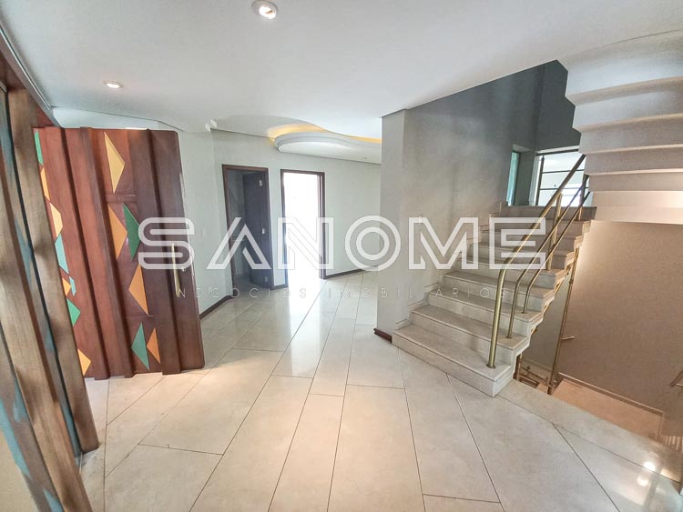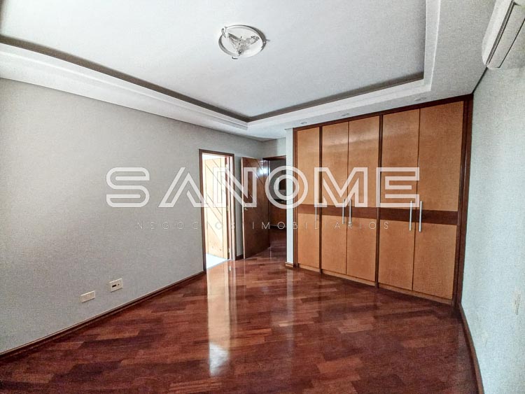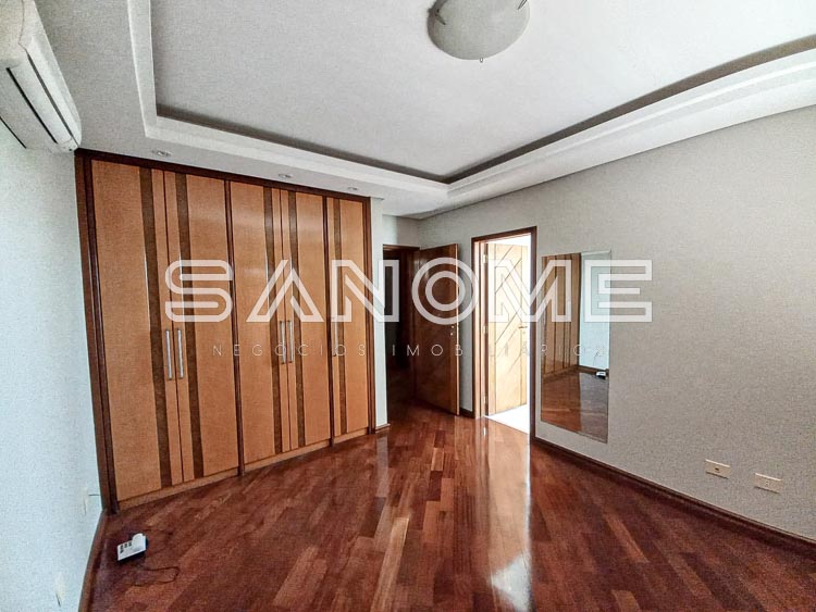 Piso superior: Suíte de hóspedes com armários e varanda, Corredor íntimo com roupeiros e copinha, Suíte master com closet, saleta, varanda e hidromassagem e 2 suítes com armários e varanda.
