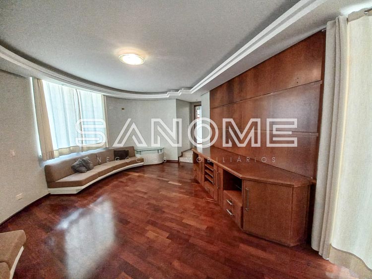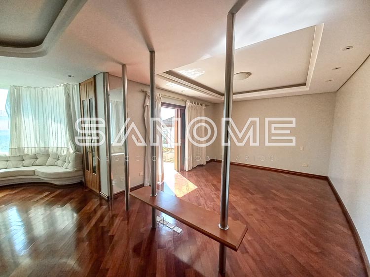 Piso superior: Suíte de hóspedes com armários e varanda, Corredor íntimo com roupeiros e copinha, Suíte master com closet, saleta, varanda e hidromassagem e 2 suítes com armários e varanda.