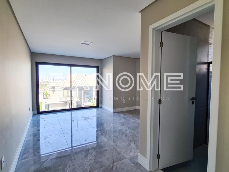 5 suítes (master com hidromassagem e 1 suíte de hóspedes no piso inferior), Sala 3 ambientes integrados, Lavabo, Cozinha integrada, Área de serviço com despensa, Área gourmet, Banheiro de lazer externo, Quintal gramado nos fundos e Piscina com infraestrutura para aquecimento.
