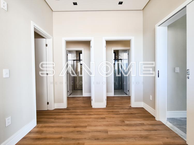 5 suítes (master com hidromassagem e 1 suíte de hóspedes no piso inferior), Sala 3 ambientes integrados, Lavabo, Cozinha integrada, Área de serviço com despensa, Área gourmet, Banheiro de lazer externo, Quintal gramado nos fundos e Piscina com infraestrutura para aquecimento.