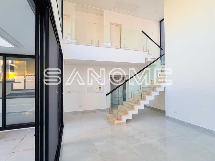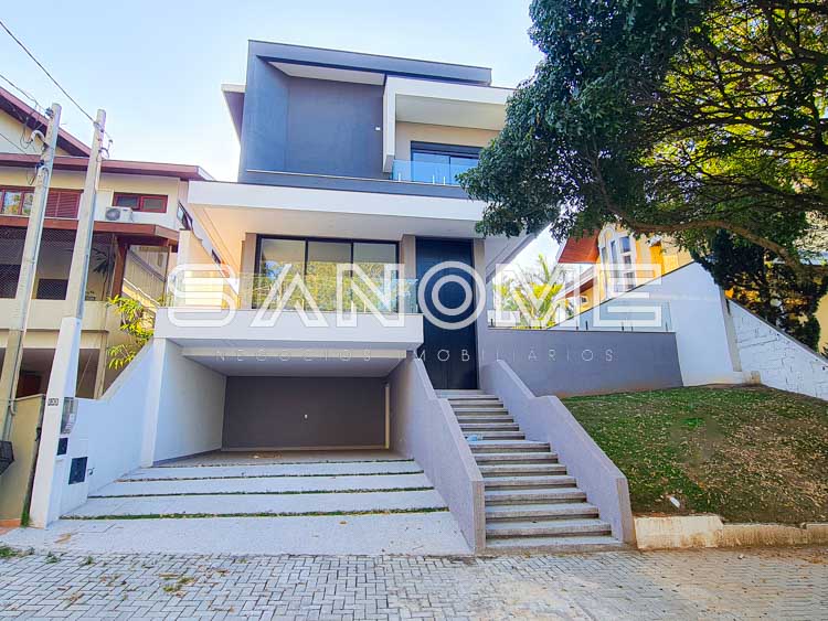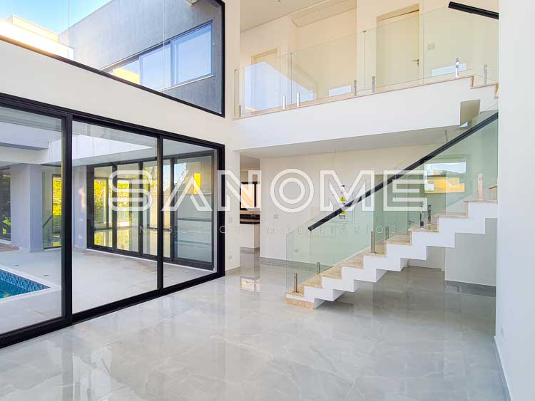 Piso térreo: Sala de estar, Sala de jantar, Lavabo, Escritório, Cozinha com ilha integrada, Área de serviço, Área de lazer (piscina e banheiro externo) com vista para área verde (sem vizinhos de frente).