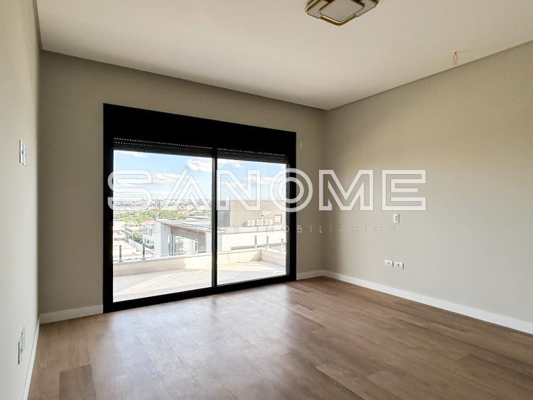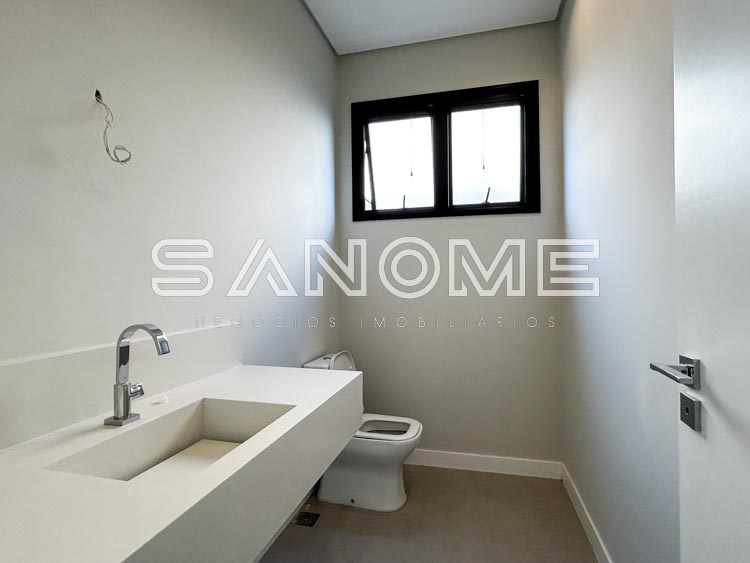 Piso térreo: Hall de entrada, Lavabo, Escritório (reversível +1 suíte), Sala 2 ambientes, Jardim de inverno, Cozinha integrada, Despensa, Área de serviço, Banheiro de empregados, Varanda gourmet, Banheiro de lazer externo, Quintal gramado nos fundos e Piscina com prainha e borda infinita.