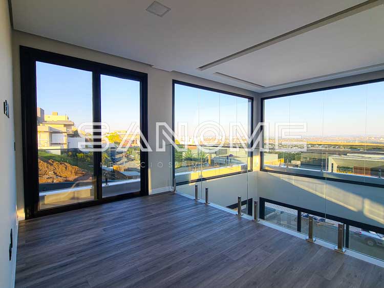 Piso superior: Sala íntima com vista e varanda, Sala de TV e 4 suítes (master com closet e sala de banho).