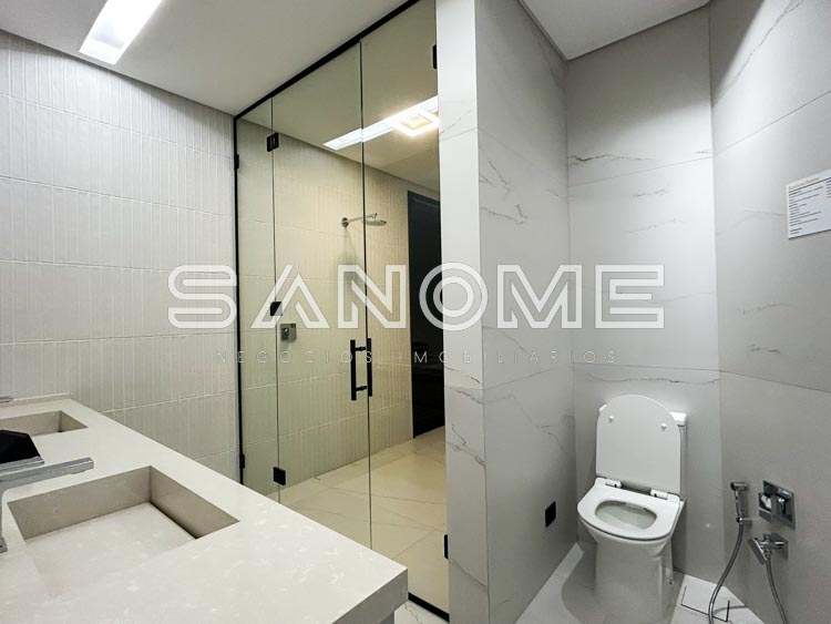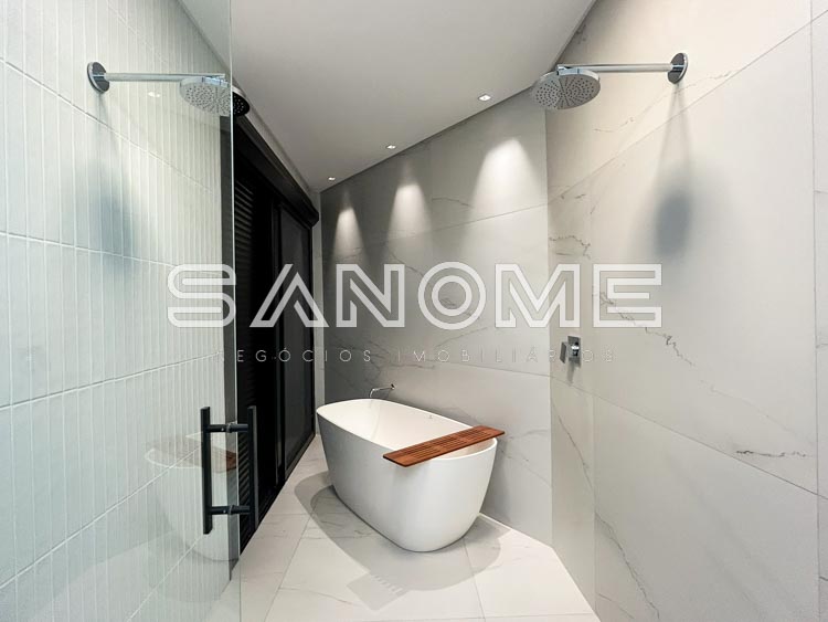 Elevador instalado com acesso aos 3 pavimentos, Sunset lounge com vista para Serra da Mantiqueira, Suíte máster com varanda privativa de 41m², Banheiro máster com banheira Sabbia, Marcenaria cozinha, gourmet e banheiros by SCA e Gourmet equipada com churrasqueira Evol.