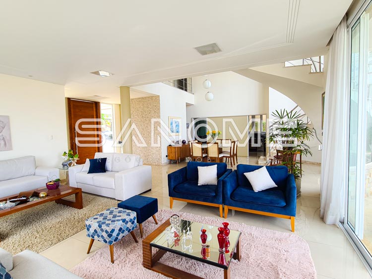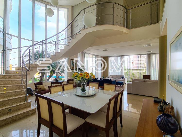 4 suítes com varanda (1 máster com sala de banho, closet e varanda com vista livre), Sala 3 ambientes com pé direito duplo e saída para área externa, Sala íntima no piso superior, Lavabo e Escritório.