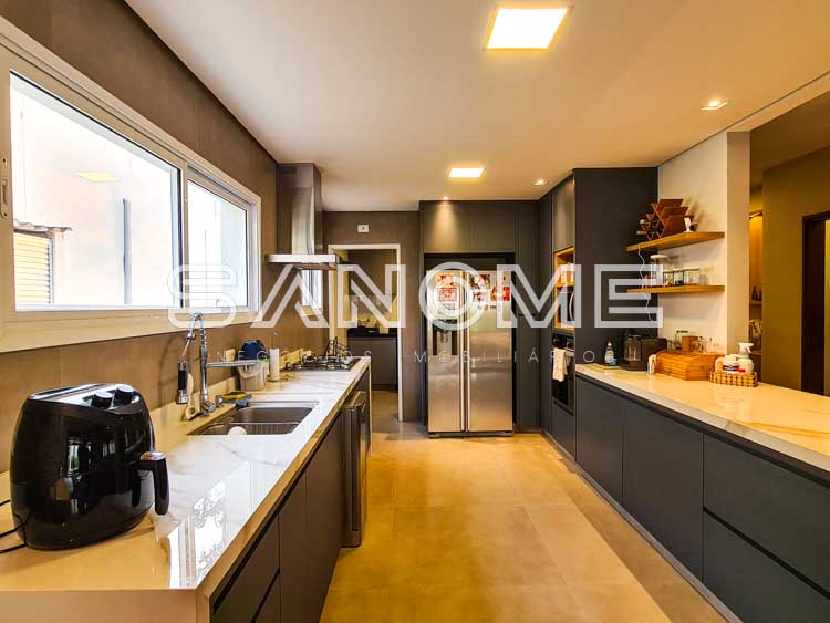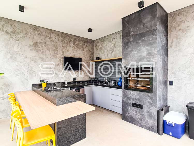 Piso térreo: Hall de entrada, Sala de TV com lareira, Sala de jantar, Lavabo (com entrada/saída para área externa), Cozinha integrada, Área de serviço, Suíte de hóspedes (reversível para escritório), Varanda externa, Área gourmet e Piscina.