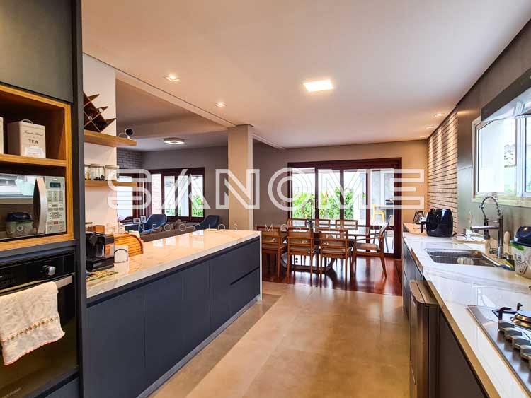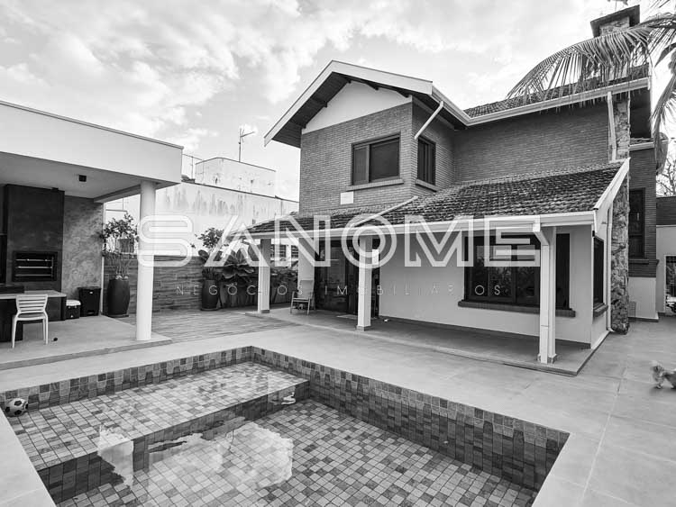 Piso térreo: Hall de entrada, Sala de TV com lareira, Sala de jantar, Lavabo (com entrada/saída para área externa), Cozinha integrada, Área de serviço, Suíte de hóspedes (reversível para escritório), Varanda externa, Área gourmet e Piscina.