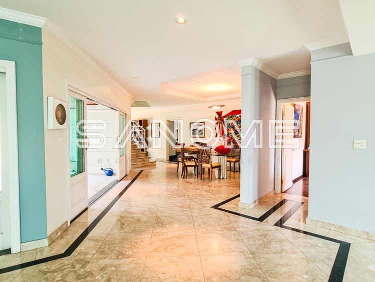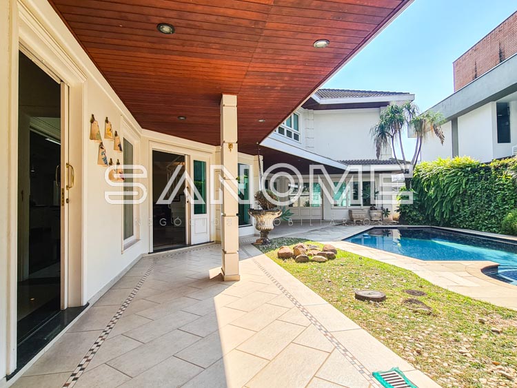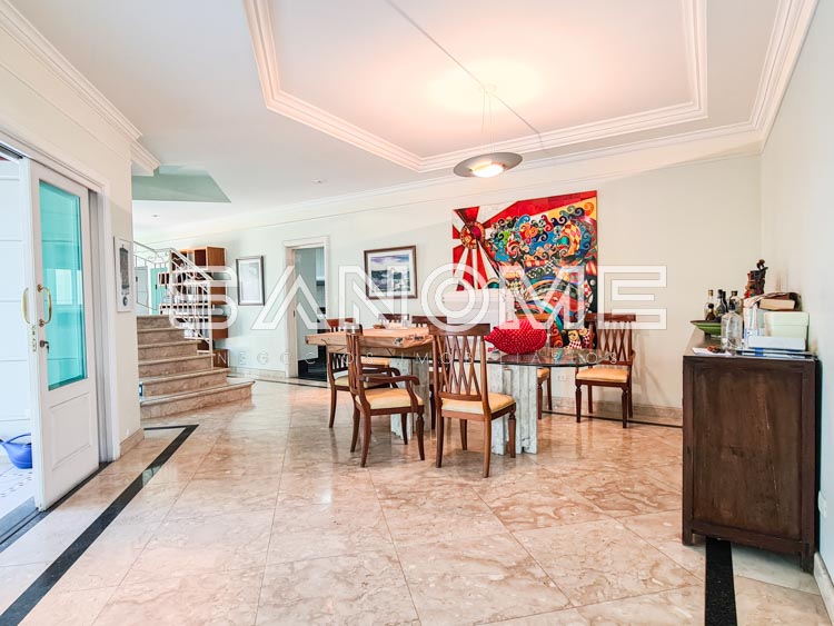 Churrasqueira e forno de pizza, Banheiro externo com chuveiro, Piscina, Cozinha com copa e despensa, Área de serviço, Suíte de empregados, Varanda externa, Sala íntima no piso superior com copinha e Amplo sótão com varanda externa e vista livre.