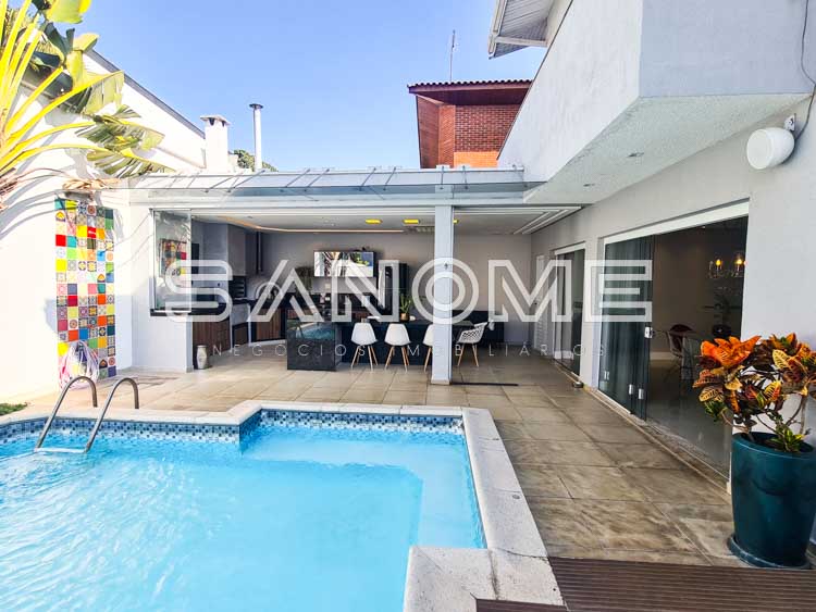 Piso térreo: Sala de estar com bar e adega, Sala de jantar, Lavabo, Sala de TV, Escritório, Cozinha integrada, Despensa, Área de serviço, Área gourmet completa, Banheiro de lazer externo e Piscina com cascata.