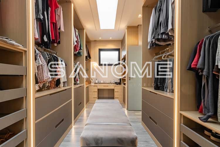 5 suítes, 1 Sala íntima reversível para sexta suíte, Escritório e copa no piso superior, Lavabo, Poço para instalação de elevador, Home Theater e Cômodo multiuso.
