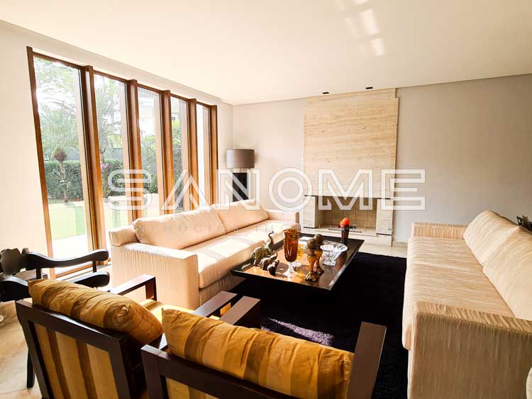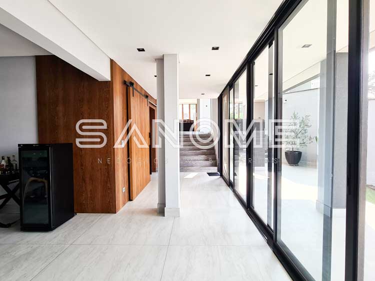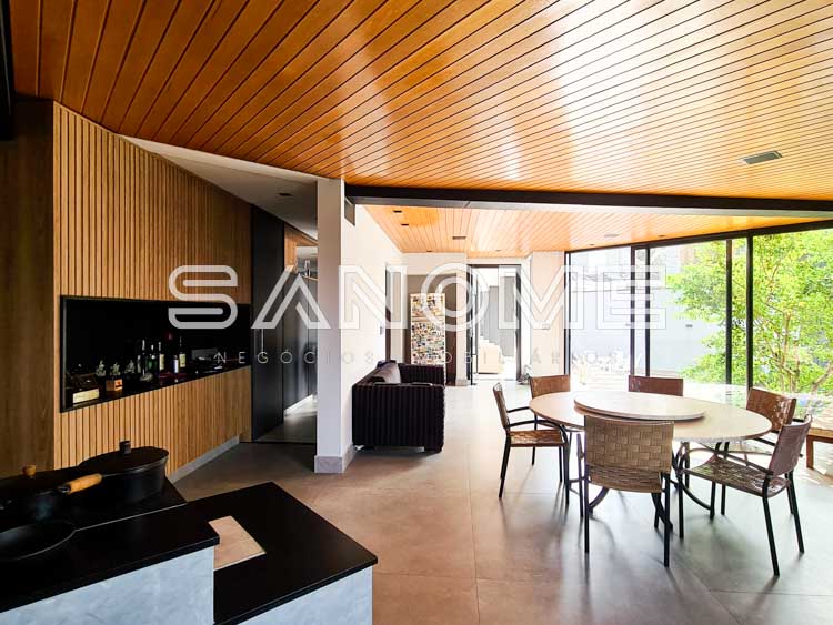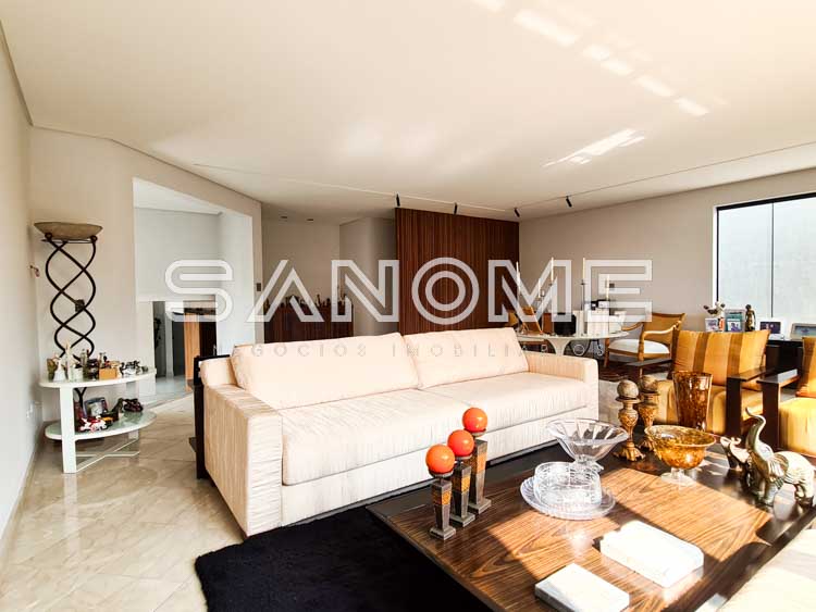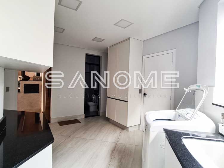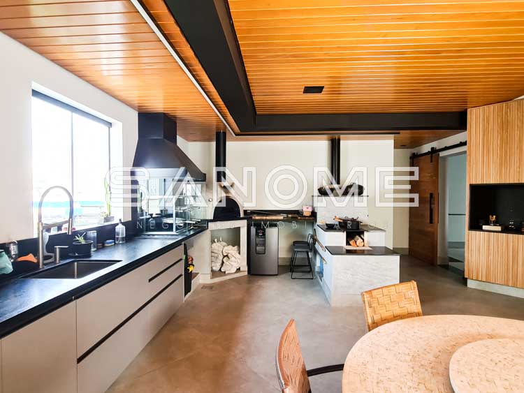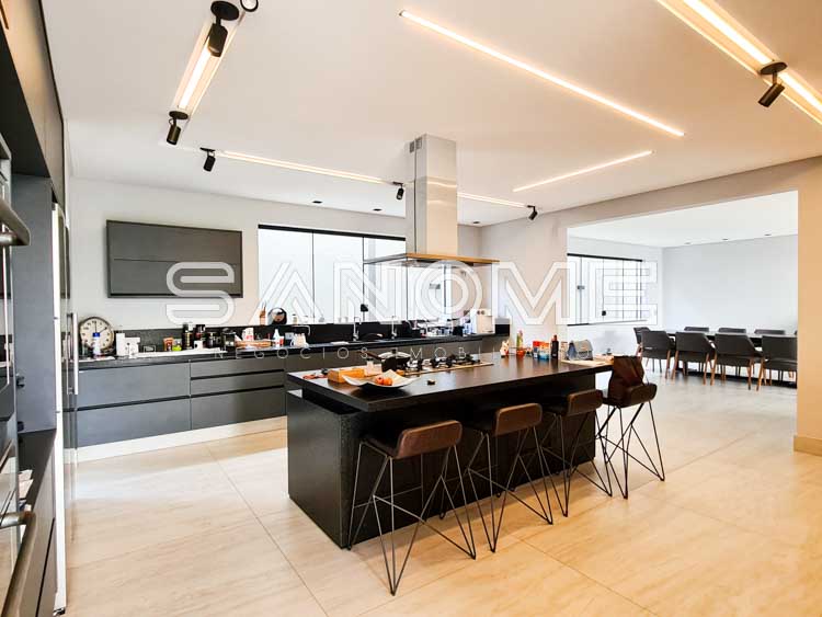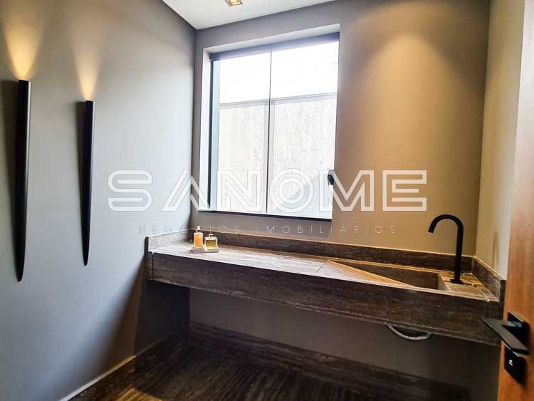 Piso principal: Ampla sala de estar com lareira, Lavabo, Home Theater, Sala de jantar, Elevador, Ampla cozinha planejada com ilha, Área de serviço com banheiro de empregados, Área gourmet completa, Banheiro de lazer, Varanda externa e Piscina com spa.