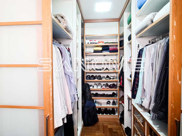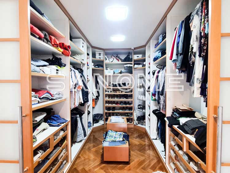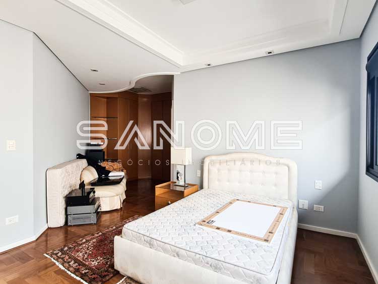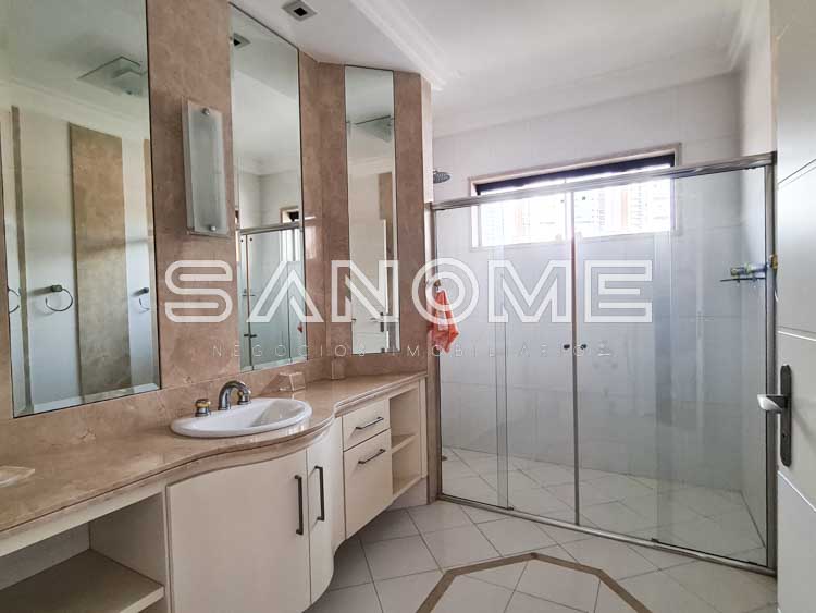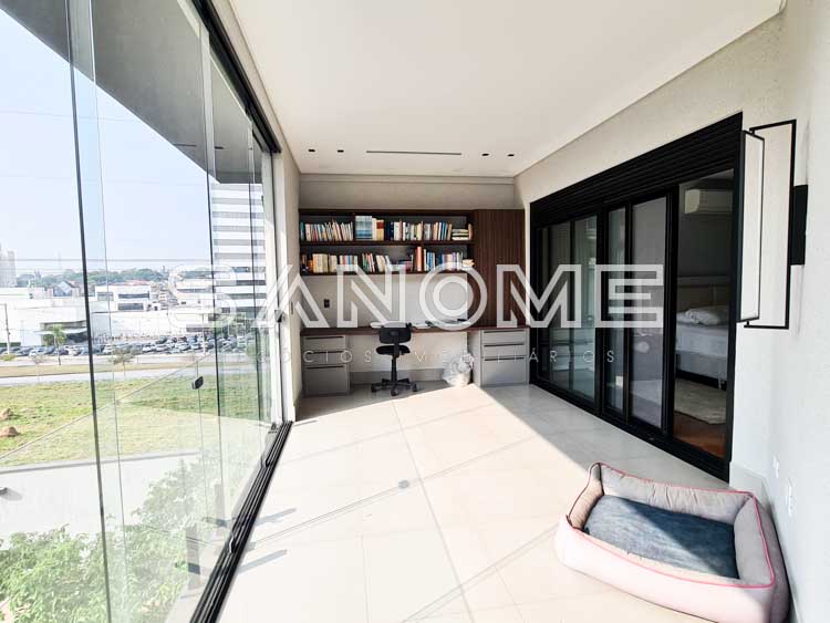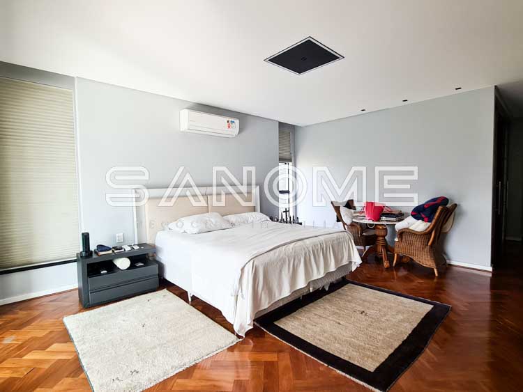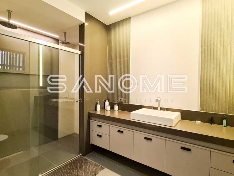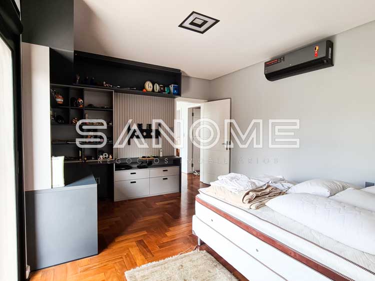 Piso superior: Corredor com armários + 4 suítes com closet (master com sala de banho e varanda externa com fechamento em vidro).
