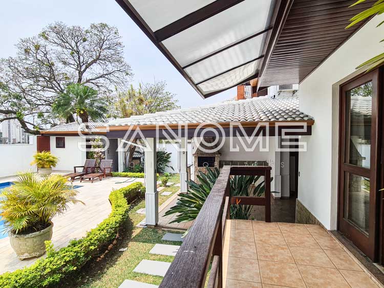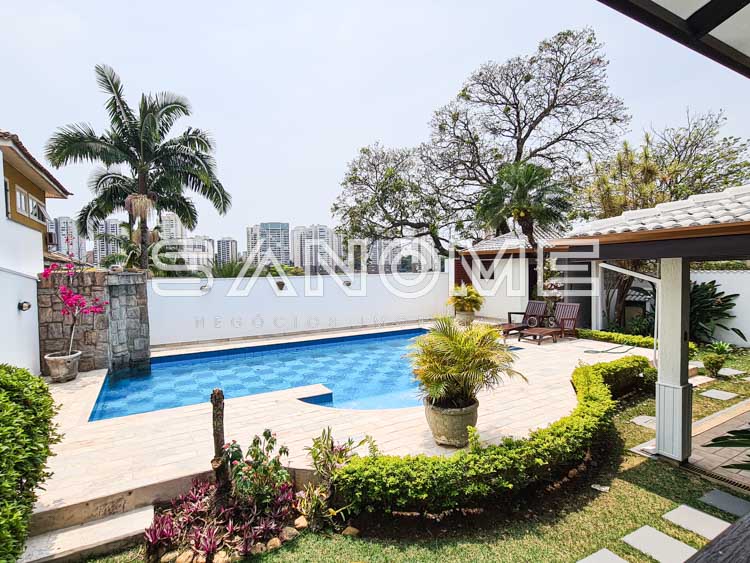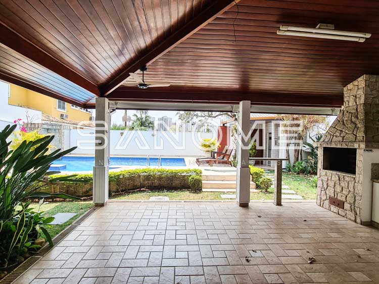Piso principal: Hall de entrada com lavabo, Ampla sala 2 ambientes, Cozinha planejada, Despensa, Área de serviço, Banheiro e quarto de empregados, Área de churrasqueira, Varanda externa, Amplo quintal com paisagismo, Sauna, Banheiro de lazer externo e Piscina.
