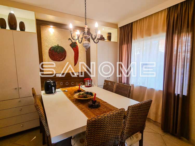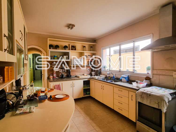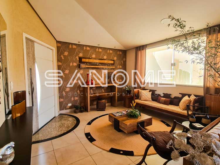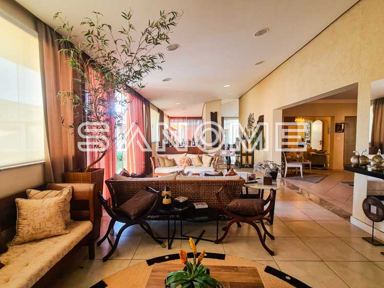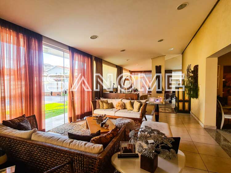 Piso térreo: Living na entrada, Sala de estar com lareira, Lavabo, Sala de TV, Sala de jantar, Ampla varanda externa com acesso para a área de lazer, Cozinha planejada, Copa, 1 suíte de hóspedes interna, Salão gourmet com fechamento em vidro, Área de serviço com banheiro de empregados, 1 suíte de hóspedes externa, Amplo quintal gramado, Jacuzzi e Piscina.