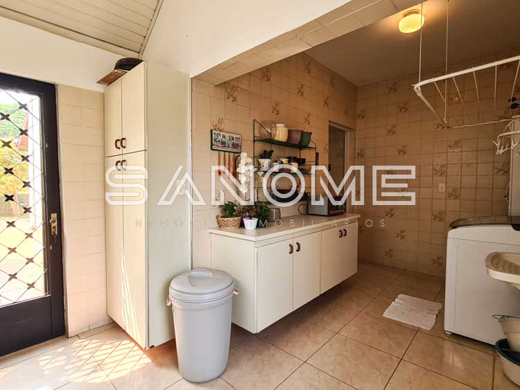 Piso térreo: Sala de estar, Sala de TV, Lavabo, Cozinha com copa, Despensa, Área de serviço, Quintal gramado, Piscina e Edícula.