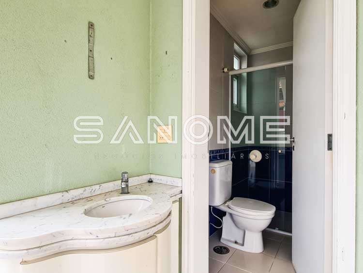 Piso térreo: Sala 3 ambientes integrados (pé direito duplo), Escritório, Lavabo, Lareira, Sala de almoço com armários, Cozinha planejada (com cooktop 5 bocas e forno embutido), Despensa, Área de serviço, Lavanderia, Banheiro de empregados, Quarto de empregados, Área gourmet completa (churrasqueira e forno a lenha), Banheiro de lazer externo e Piscina aquecida 50mil litros com spa.