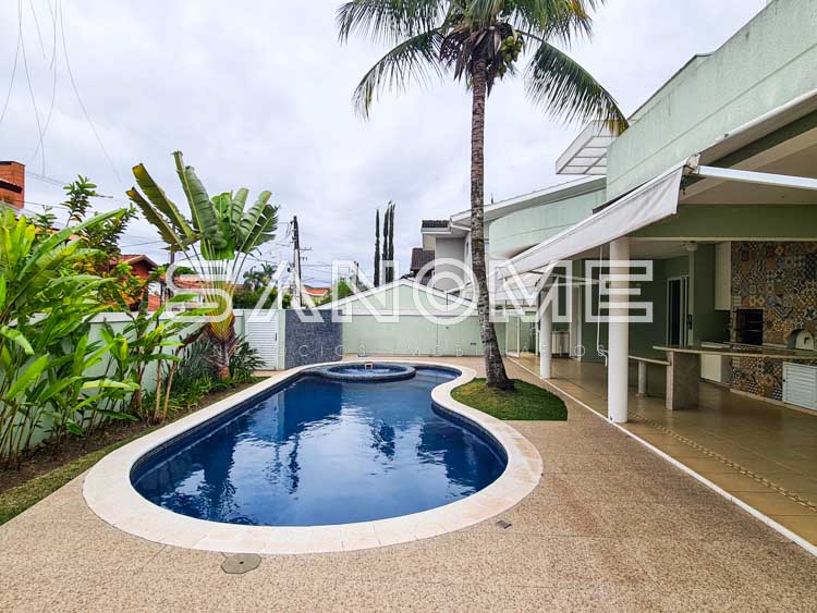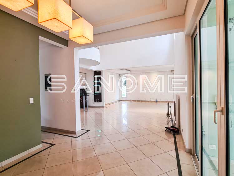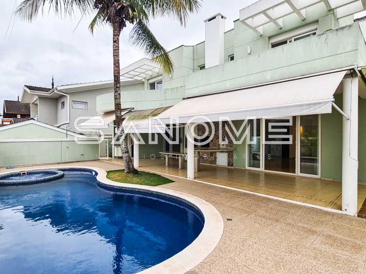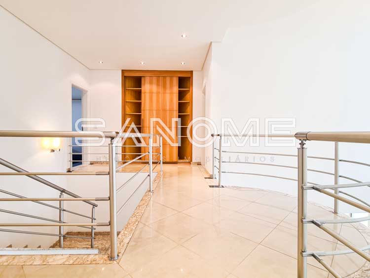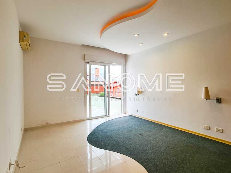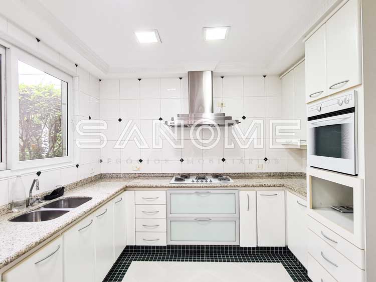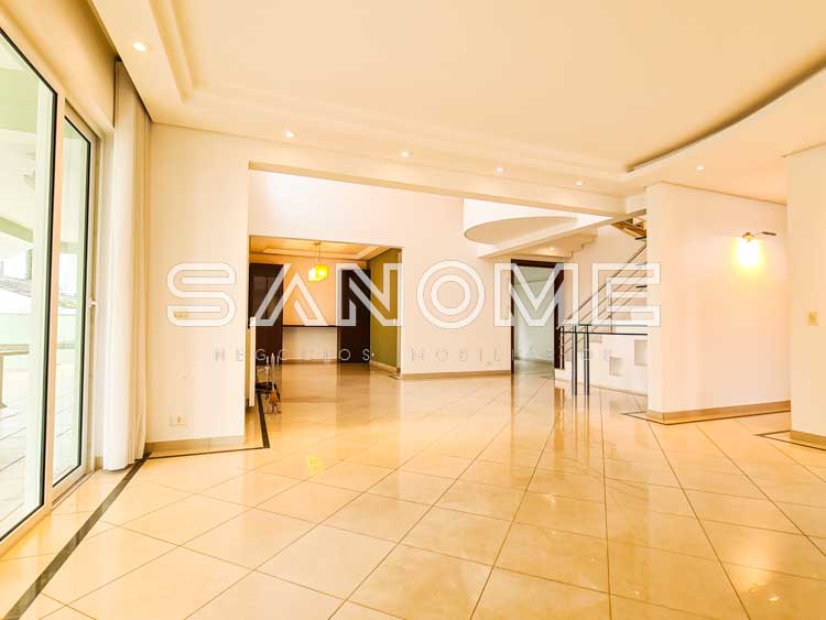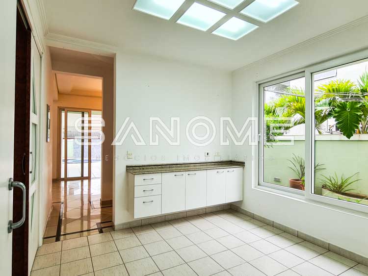 Piso térreo: Sala 3 ambientes integrados (pé direito duplo), Escritório, Lavabo, Lareira, Sala de almoço com armários, Cozinha planejada (com cooktop 5 bocas e forno embutido), Despensa, Área de serviço, Lavanderia, Banheiro de empregados, Quarto de empregados, Área gourmet completa (churrasqueira e forno a lenha), Banheiro de lazer externo e Piscina aquecida 50mil litros com spa.