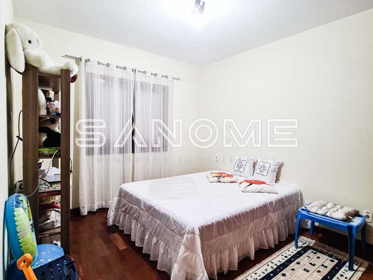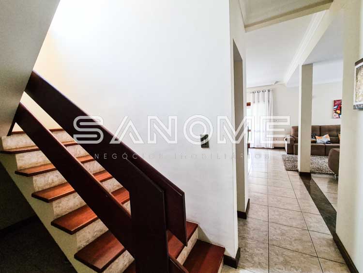 Piso superior: Banheiro social, Sacada e 3 dormitórios (1 suíte master com closet e banheira).