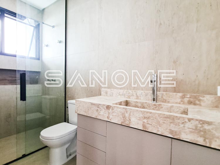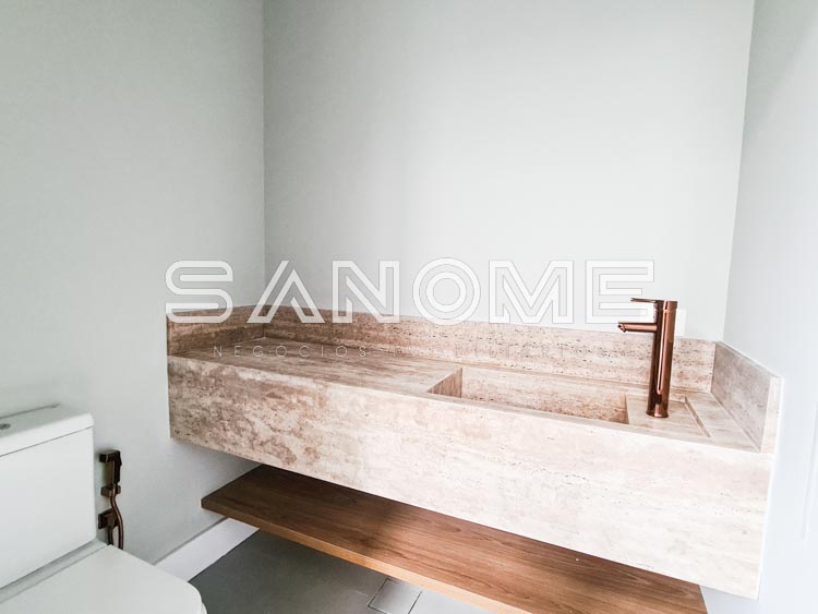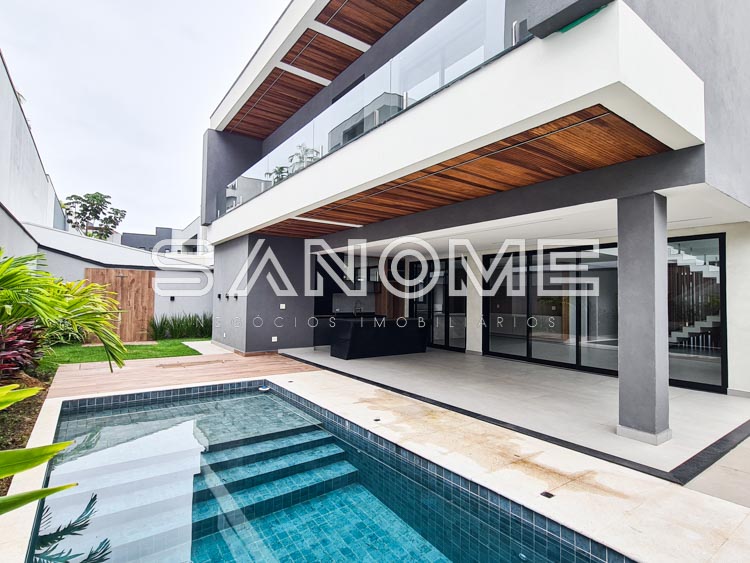 Piso térreo: Sala de TV com banheiro social, Sala 2 ambientes integrados, Lavabo, Cozinha com bancada em mármore, Área de serviço, Despensa, Área gourmet com bancada em mármore, Banheiro de lazer externo, Piscina, Ducha, Depósito e Paisagismo.