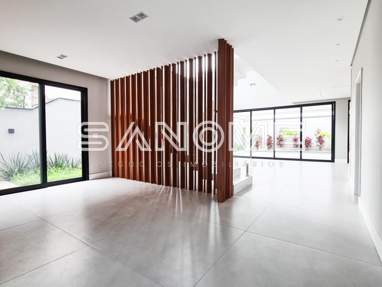 Piso térreo: Sala de TV com banheiro social, Sala 2 ambientes integrados, Lavabo, Cozinha com bancada em mármore, Área de serviço, Despensa, Área gourmet com bancada em mármore, Banheiro de lazer externo, Piscina, Ducha, Depósito e Paisagismo.