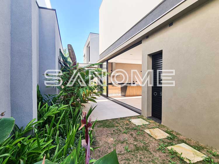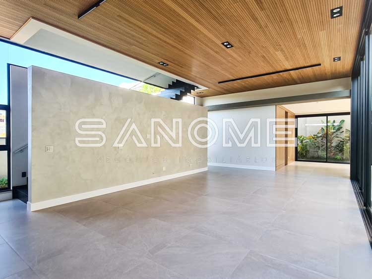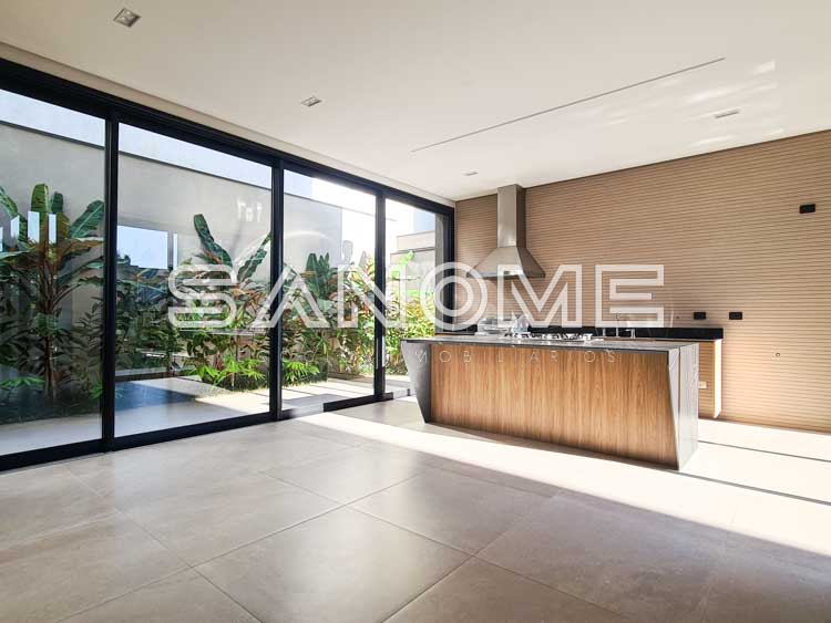 Piso térreo: Salas integradas, Sala de TV, Lavabo, Cozinha gourmet integrada, Área de serviço, Despensa, Quintal gramado, Banheiro de lazer externo, Piscina e Hobby Box.