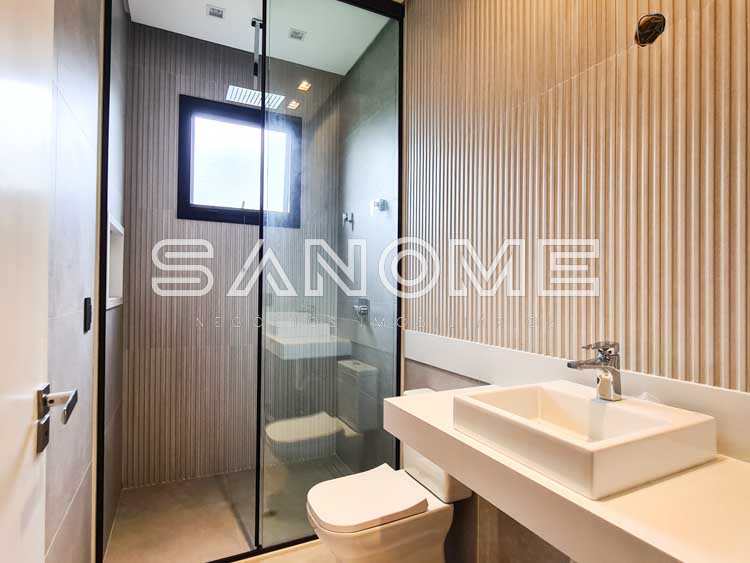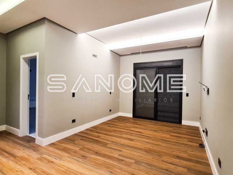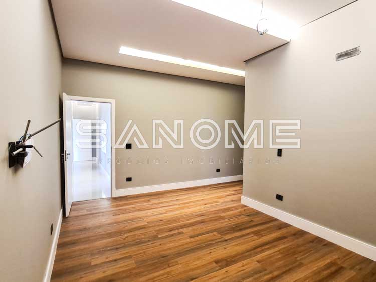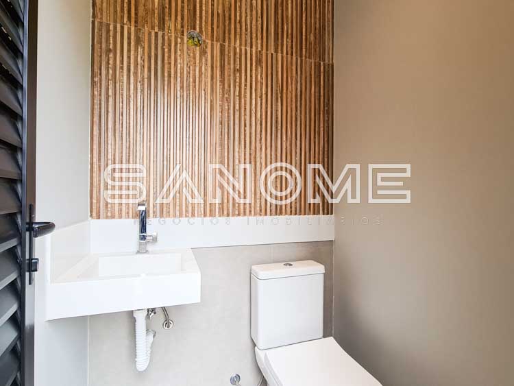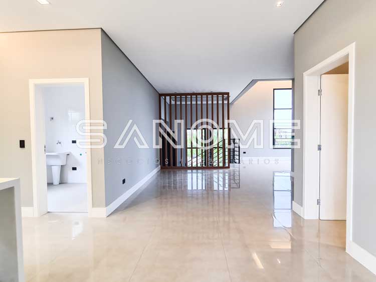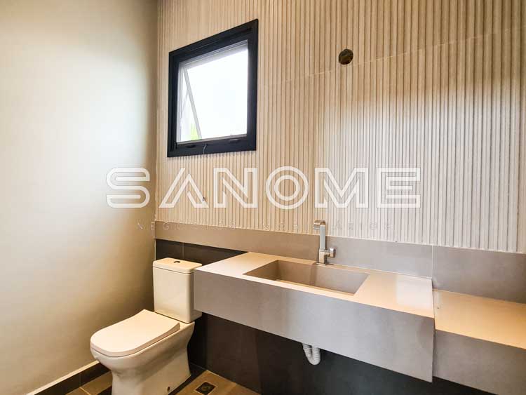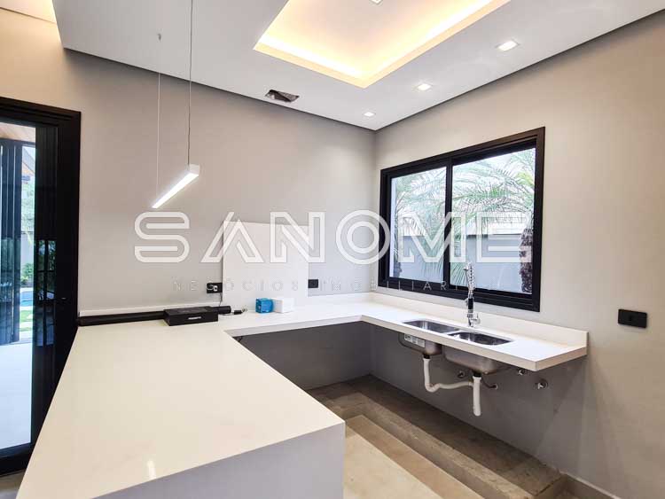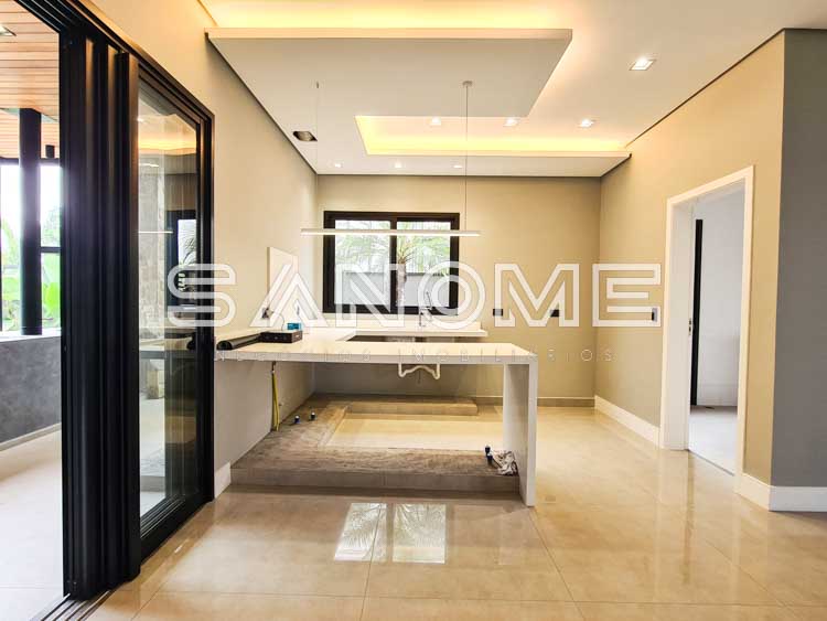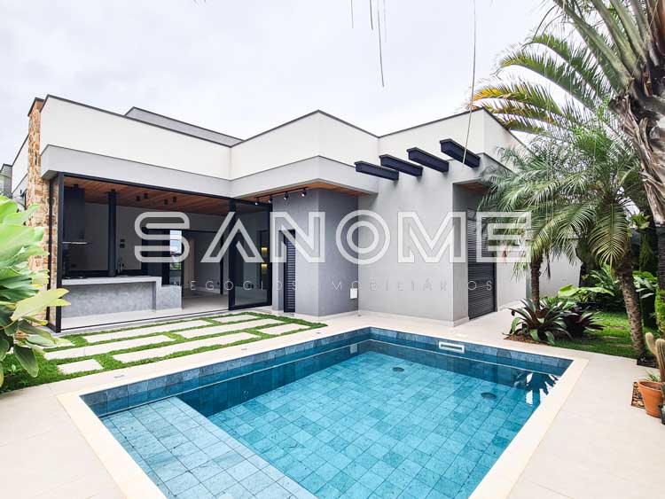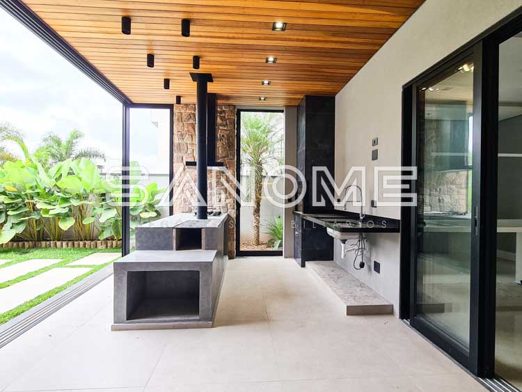 Térrea, 3 suítes, Escritório, Salas integradas, Lavabo, Cozinha integrada, Área de serviço, Área gourmet (com fogão cooktop, churrasqueira, forno à lenha e chopeira), Banheiro de lazer externo, Adega, Depósito e Piscina.