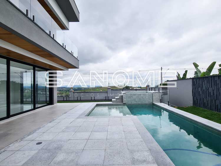 Piso térreo: Salas integradas, Sala de TV, Lavabo, Cozinha integrada, Despensa, Área de serviço e Quintal com piscina e spa.