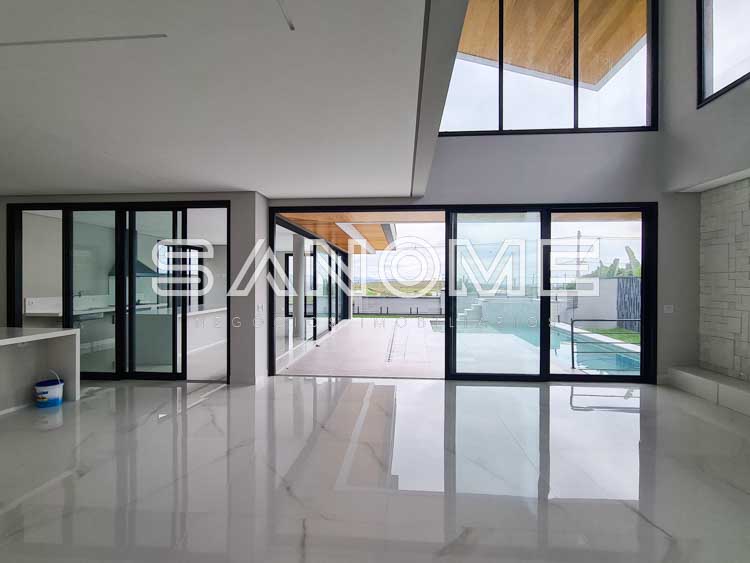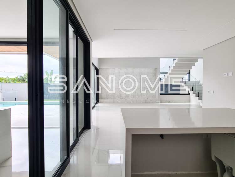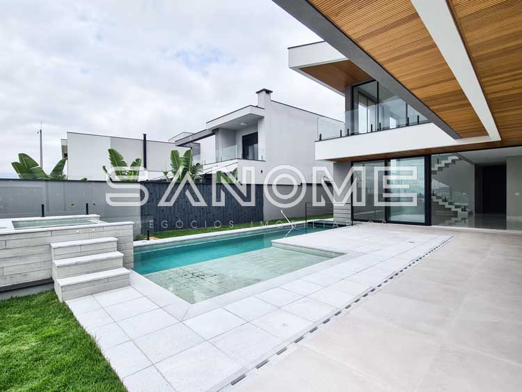 Piso térreo: Salas integradas, Sala de TV, Lavabo, Cozinha integrada, Despensa, Área de serviço e Quintal com piscina e spa.