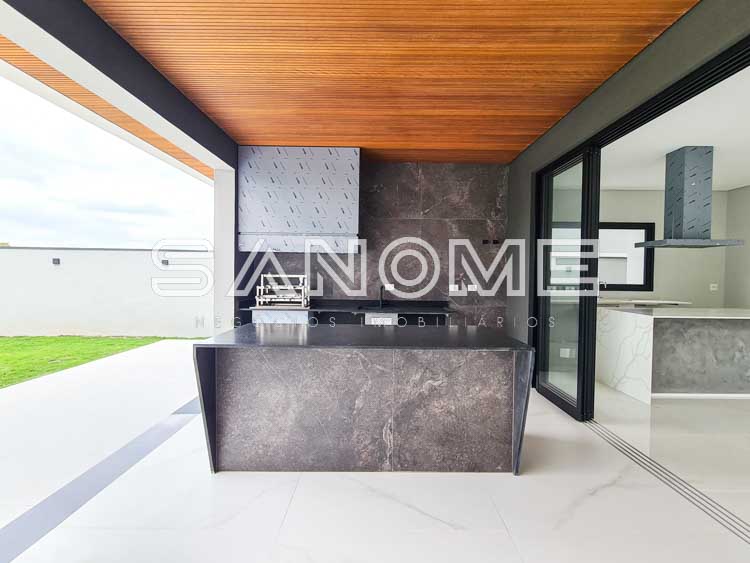 Piso térreo: Salas integradas, Escritório, Lavabo, Cozinha integrada, Área de serviço com despensa, Área gourmet, Banheiro de lazer externo, Depósitos e Piscina.