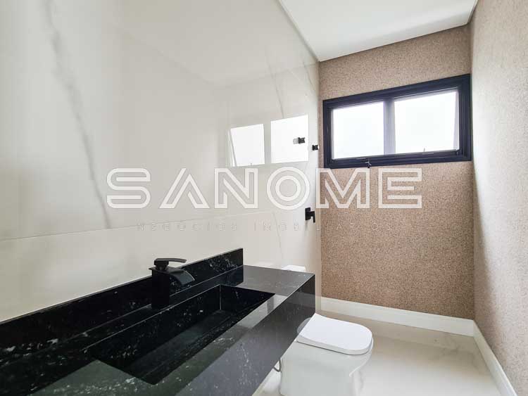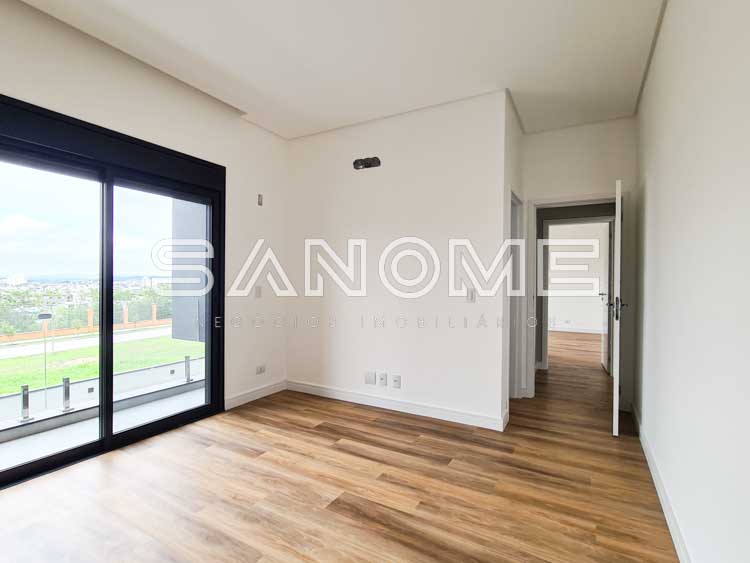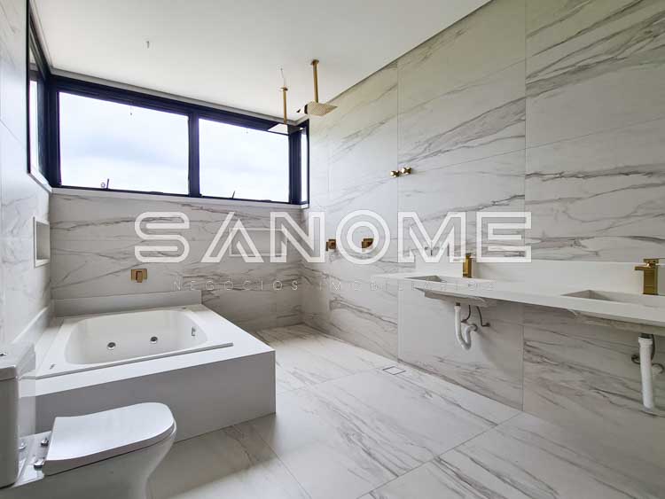 Piso superior: Sala íntima com varanda + 4 suítes (master com closet e banheira).